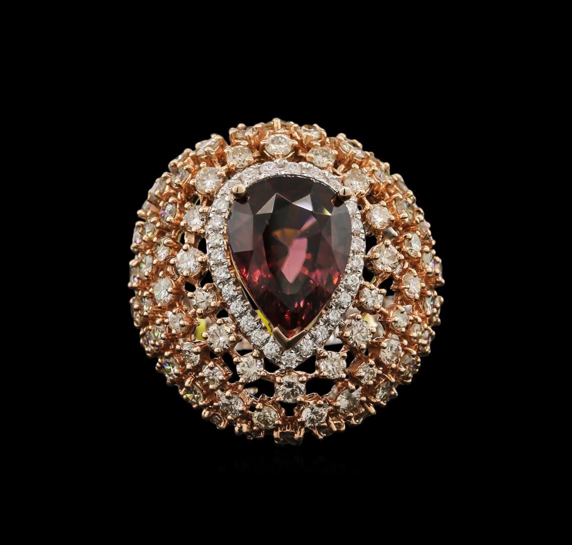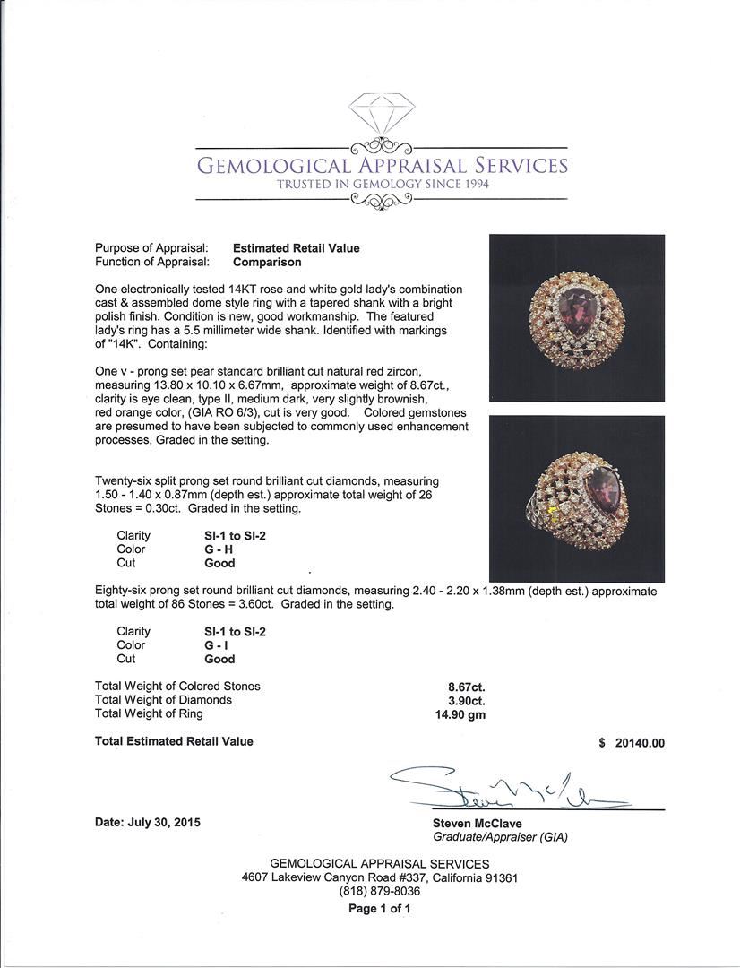 One electronically tested 14KT rose and white gold lady's combination cast & assembled dome style ring with a tapered shank with a bright polish finish. The featured lady's ring has a 5.5 millimeter wide shank. Identified with markings of "14K". Condition is new, good workmanship. Containing: One v - prong set pear standard brilliant cut natural red zircon, measuring 13.80 x 10.10 x 6.67mm, approximate weight of 8.67ct., clarity is eye clean, type II, medium dark, very slightly brownish, red orange color, (GIA RO 6/3), cut is very good. Colored gemstones are presumed to have been subjected to commonly used enhancement processes, Graded in the setting. Twenty-Six split prong set round brilliant cut diamonds, measuring 1.50 - 1.40 x 0.87mm (depth est.) approximate. Total Weight of 26 Stones = 0.30ct. Graded in the setting. Clarity: SI-1 to SI-2. Color: G - Good Eighty-Six prong set round brilliant cut diamonds, measuring 2.40 - 2.20 x 1.38mm (depth est.) approximate. Total Weight of 86 Stones = 3.60ct. Graded in the setting. Clarity: SI-1 to SI-2. Color: G - I. Cut Good. Total Weight of Colored Stones 8.67ct. Total Weight of Diamonds 3.90ct. Total Weight of Ring 14.90gm. GAS Appraised at $20,140.00.