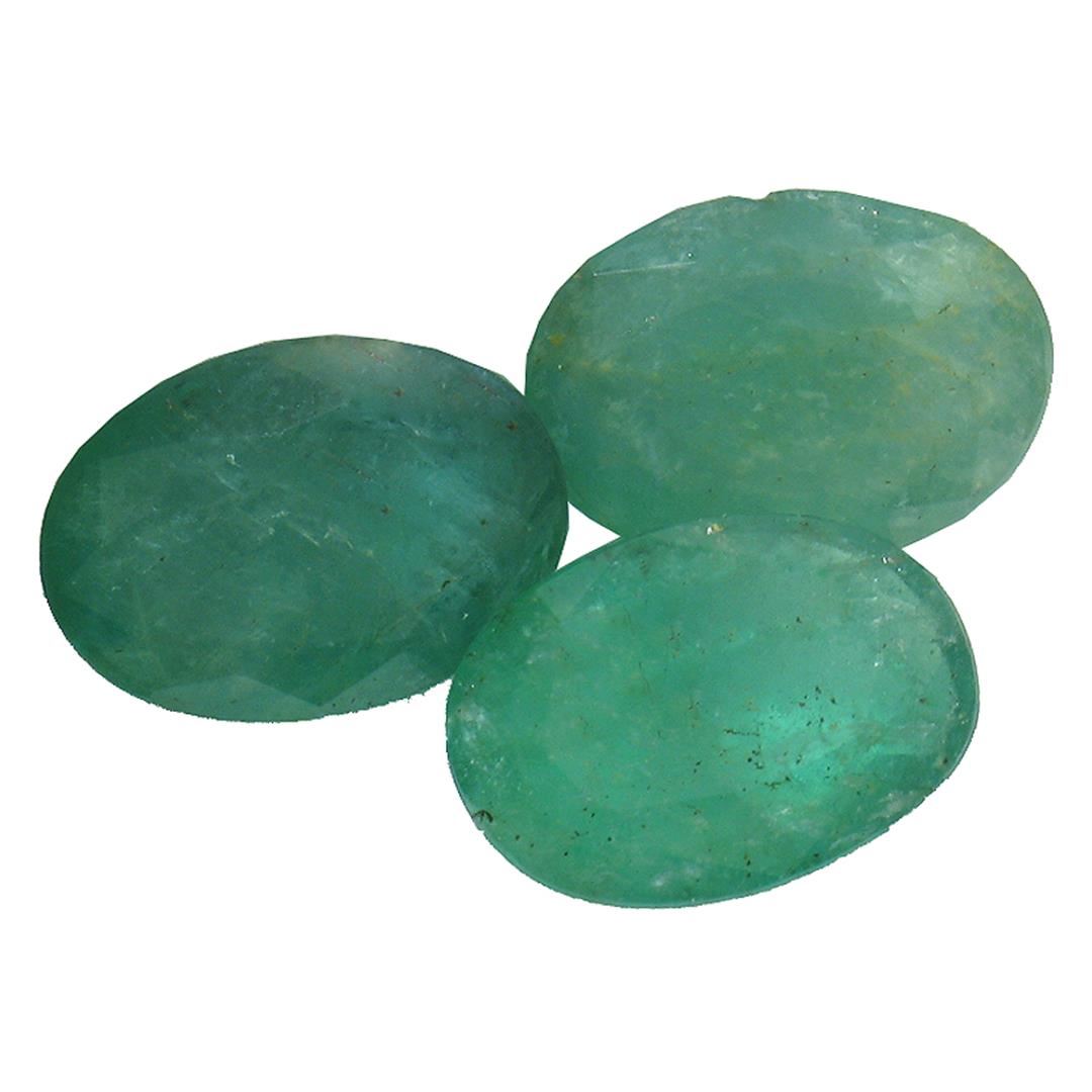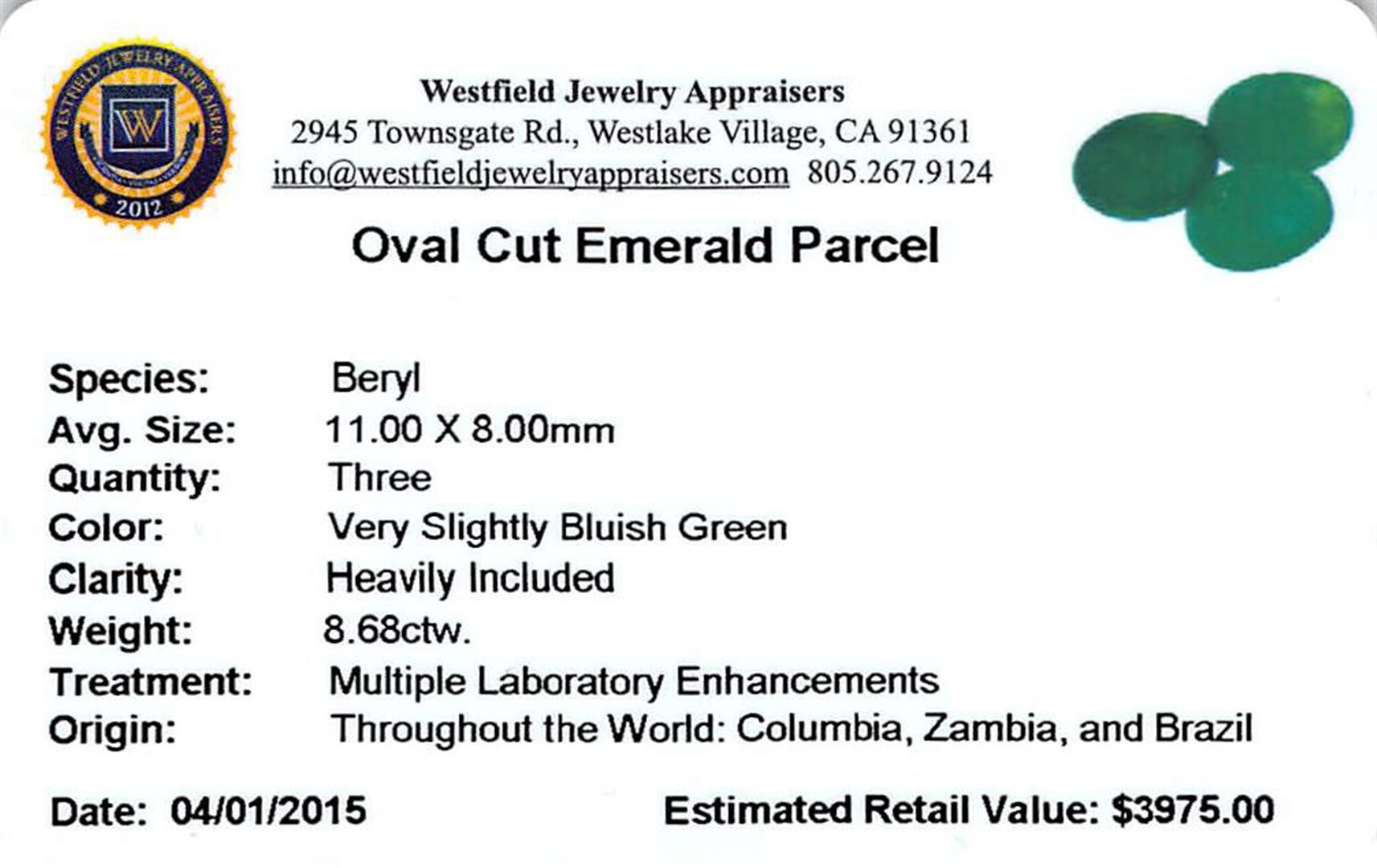 Three oval mixed cut natural emeralds exact total weight 8.68ct., clarity is heavily included, type III, medium dark, very slightly grayish, very slightly bluish green color, (GIA vslbG 6/3), cut is good. Westfield Appraised at $3,975.00.