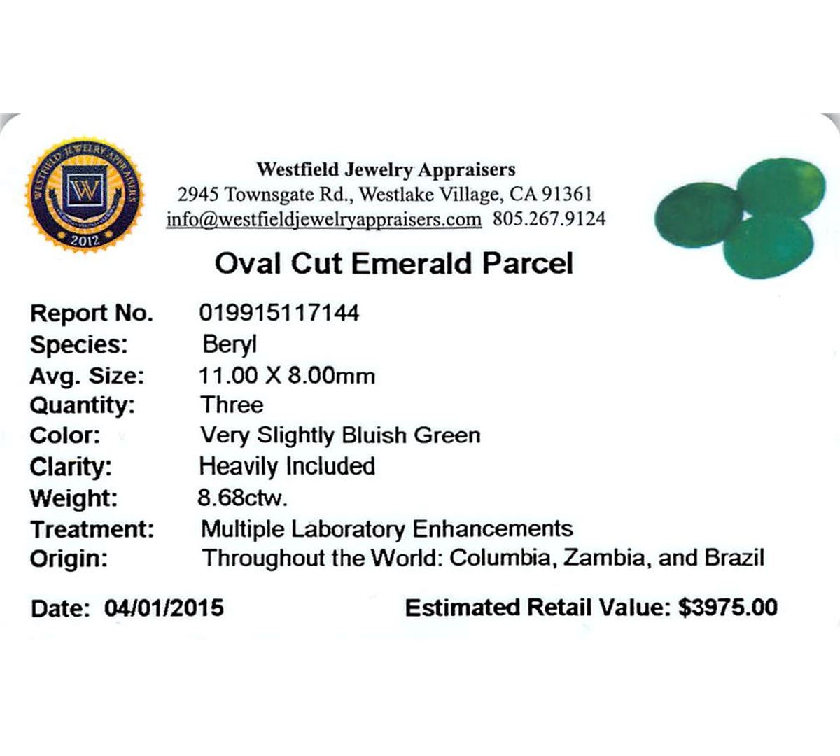 Three oval mixed cut natural emeralds exact total weight 8.68ct., clarity is heavily included, type III, medium dark, very slightly grayish, very slightly bluish green color, (GIA vslbG 6/3), cut is good. Westfield Appraised at $3,975.00.