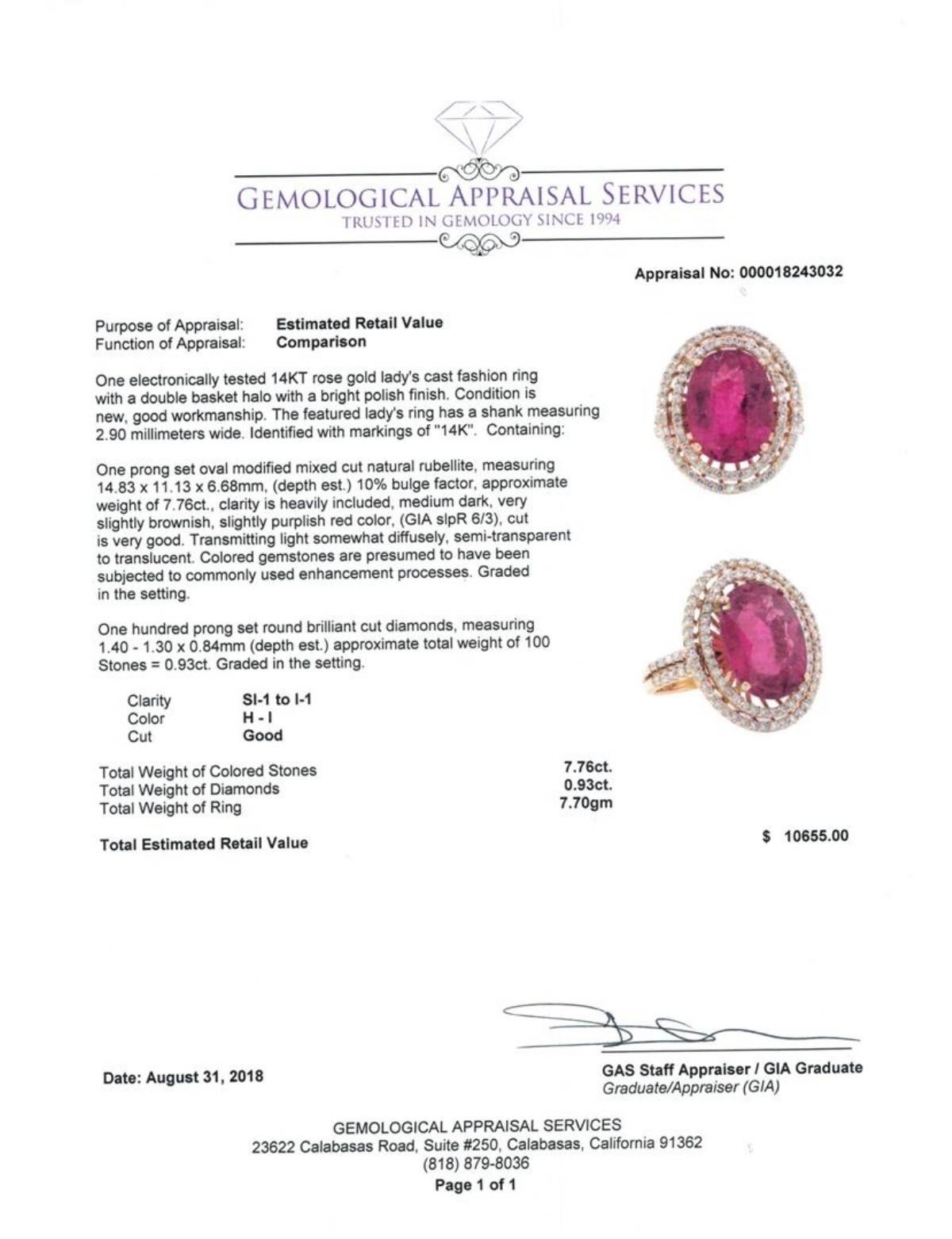 One electronically tested 14KT rose gold lady's cast fashion ring with a double basket halo with a bright polish finish. The featured lady's ring has a shank measuring 2.90 millimeters wide. Identified with markings of '14K'. Condition is new, good workmanship. Containing: One prong set oval modified mixed cut natural rubellite, measuring 14.83 x 11.13 x 6.68mm, (depth est.) 10%. bulge factor, approximate weight of 7.76ct., clarity is heavily included, medium dark, very slightly brownish, slightly purplish red color, (GIA slpR 6/3), cut is very good. Transmitting light somewhat diffusely, semi-transparent to translucent. Colored gemstones are presumed to have been subjected to commonly used enhancement processes. Graded in the setting. One Hundred prong set round brilliant cut diamonds, measuring 1.40 - 1.30 x 0.84mm (depth est.) approximate total weight of 100 Stones = 0.93ct. Graded in the setting. Color H - I Clarity SI-1 to I-1 Cut Good. Total Weight of Colored Stones 7.76ct.. Total Weight of Diamonds 0.93ct.. Total Weight of Ring 7.70gm GAS Appraised at  $10655.00. GAS Appraised.