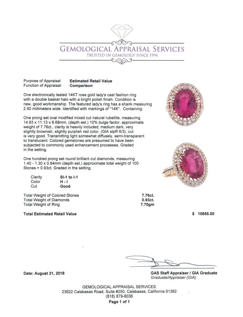 One electronically tested 14KT rose gold lady's cast fashion ring with a double basket halo with a bright polish finish. The featured lady's ring has a shank measuring 2.90 millimeters wide. Identified with markings of '14K'. Condition is new, good workmanship. Containing: One prong set oval modified mixed cut natural rubellite, measuring 14.83 x 11.13 x 6.68mm, (depth est.) 10%. bulge factor, approximate weight of 7.76ct., clarity is heavily included, medium dark, very slightly brownish, slightly purplish red color, (GIA slpR 6/3), cut is very good. Transmitting light somewhat diffusely, semi-transparent to translucent. Colored gemstones are presumed to have been subjected to commonly used enhancement processes. Graded in the setting. One Hundred prong set round brilliant cut diamonds, measuring 1.40 - 1.30 x 0.84mm (depth est.) approximate total weight of 100 Stones = 0.93ct. Graded in the setting. Color H - I Clarity SI-1 to I-1 Cut Good. Total Weight of Colored Stones 7.76ct.. Total Weight of Diamonds 0.93ct.. Total Weight of Ring 7.70gm GAS Appraised at $10655.00. GAS Appraised at $10,655.00.