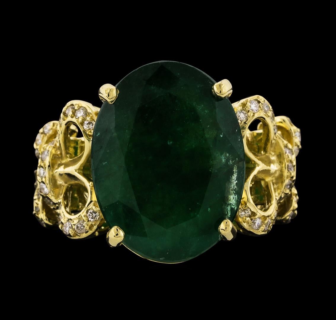 One electronically tested 14KT yellow gold lady's cast fashion ring with a cathedral shank with a bright polish finish. The featured lady's ring has diamond set bow motif shoulders and a shank measuring 2.60 millimeters wide. Identified with markings of 'K14'. Condition is new, good workmanship. Containing: One prong set oval modified mixed cut natural emerald, measuring 15.56 x 11.80 x 7.40mm, (depth est.) 13%. bulge factor, approximate weight of 8.71ct., clarity is heavily included, medium dark, moderately strong, green color, (GIA G 6/4), cut is good. Transmitting light somewhat diffusely, semi-transparent to translucent. Naturally occurring internal & external characteristics are present. Indications of oil residue. Colored gemstones are presumed to have been subjected to commonly used enhancement processes. Graded in the setting. Six prong set round brilliant cut diamonds, measuring 1.70 - 1.60 x 1.01mm (depth est.) approximate total weight of 6 Stones = 0.10ct. Graded in the setting. Clarity SI-1 to I-1. Color: H - I Cut Good Forty-Two prong set round brilliant cut diamonds, measuring 1.15 - 1.05 x 0.66mm (depth est.) approximate total weight of 42 Stones = 0.20ct. Graded in the setting. Clarity SI-1 to SI-3. Color: H - I Cut Good. Total Weight of Colored Stones 8.71ct.. Total Weight of Diamonds 0.30ct.. Total Weight of Ring 8.60gm. GAS Appraised at $9,775.00.