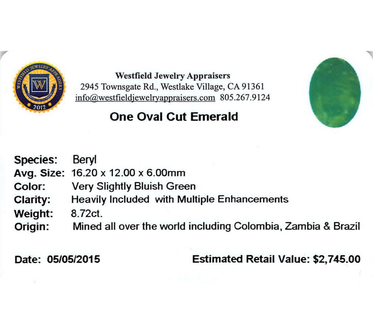One oval cut natural emerald, measuring 16.20 x 12.00 x 6.00mm, exact weight 8.72ct., clarity is moderately included, type III, medium dark, very slightly grayish, very slightly bluish green color, (GIA vslbG 6/3), cut is good. Indications of multiple laboratory enhancements, including high temperature heat treatment. Westfield Appraised at $2,745.00.