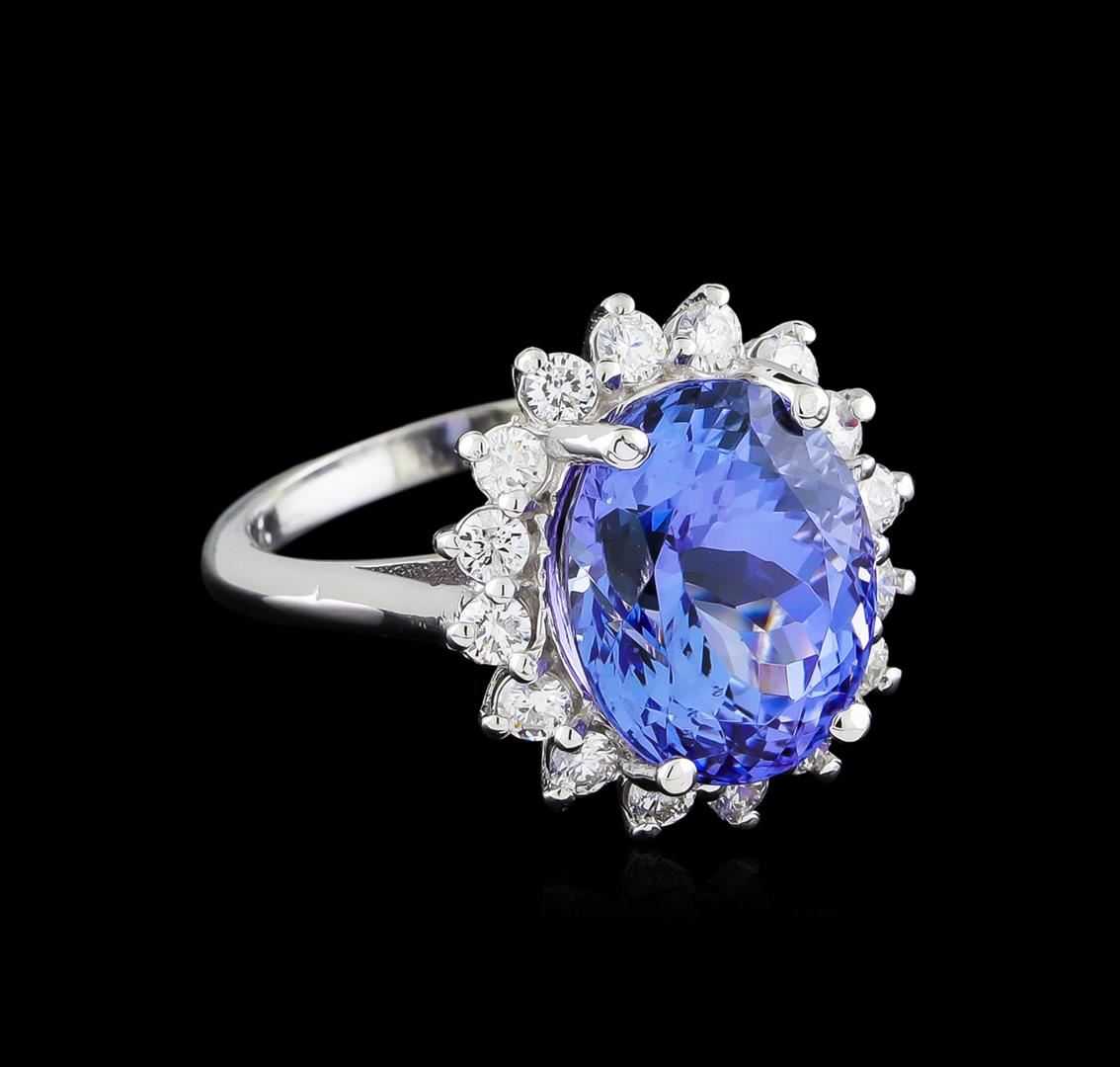 One electronically tested 14KT white gold ladies cast tanzanite and diamond ring with a bright polish finish. The featured tanzanite is set within a diamond floret supported by a ribbed under gallery, completed by a two millimeter wide band. Identified with markings of "14K". Condition is new, good workmanship. Containing: One prong set oval mixed cut natural tanzanite, measuring 13.10 x 10.50 x 9.00mm, approximate weight of 8.72ct., clarity is eye clean, type I, medium dark, very slightly grayish, bluish violet color, (GIA bV 6/3), cut is good. Transmitting light with no distortion, transparent. Colored Stone Grading Report attached. Graded in the setting. Tanzanite is a very rare gemstone that is only found in the country of Tanzania. Originally discovered in 1967. Tiffany & Company, named the stone Tanzanite. It is found in the Usumburu Mountains that border the Umba Valley of northern Tanzania. Tanzanite occurs in gray, brown, violet, blue, reddish-purple, & green. The gem is interesting because of its exceptional pleochroism. Rotated in different directions a tanzanite will exhibit multiple changes of color. Tanzanite has a low tolerance to ultrasonic cleaning, and should not be cleaned using this method. Sixteen prong set round brilliant cut diamonds, measuring 2.30 - 2.30 x 1.38mm (depth est.) approximate total weight of 16 Stones = 0.72ct. Graded in the setting. Clarity: SI-2 to I-2. Color: G - I. Total Weight of Colored Stones 8.72ct. Total Weight of Diamonds 0.72ct. Total Weight of Ring 7.13gm. AIG Appraised at $21,450.00.