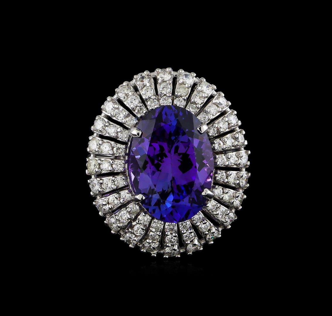 One electronically tested 14KT white gold ladies cast tanzanite and diamond ring with a bright polish finish. The featured tanzanite is set within a stylized diamond bezel supported by a ribbed under gallery, completed by a two millimeter wide band. Identified with markings of "K14". Condition is new, good workmanship. Containing: One prong set oval mixed cut natural tanzanite, measuring 15.30 x 10.80 x 7.50mm, approximate weight of 8.72ct., clarity is eye clean, type I, medium dark, very slightly grayish, bluish violet color, (GIA bV 6/3), cut is good. Transmitting light with no distortion, transparent. Colored Stone Grading Report attached. Graded in the setting. Tanzanite is a very rare gemstone that is only found in the country of Tanzania. Originally discovered in 1967. Tiffany & Company, named the stone Tanzanite. It is found in the Usumburu Mountains that border the Umba Valley of northern Tanzania. Tanzanite occurs in gray, brown, violet, blue, reddish-purple, & green. The gem is interesting because of its exceptional pleochroism. Rotated in different directions a tanzanite will exhibit multiple changes of color. Tanzanite has a low tolerance to ultrasonic cleaning, and should not be cleaned using this method. Twenty-Four prong set round brilliant cut diamonds, measuring 2.00 - 1.90 x 1.17mm (depth est.) approximate total weight of 24 Stones = 0.65ct. Graded in the setting. Clarity: SI-2 to I-2. Color: G - I Twenty-Four prong set round brilliant cut diamonds, measuring 1.60 - 1.60 x 0.96mm (depth est.) approximate total weight of 24 Stones = 0.36ct. Graded in the setting. Clarity: SI-2 to I-2. Color: G - I Twenty-Four prong set round brilliant cut diamonds, measuring 1.50 - 1.50 x 0.90mm (depth est.) approximate total weight of 24 Stones = 0.30ct. Graded in the setting. Clarity: SI-2 to I-2. Color: G - I. Total Weight of Colored Stones 8.72ct. Total Weight of Diamonds 1.31ct. Total Weight of Ring 10.90gm. AIG Appraised at $23,555.00.