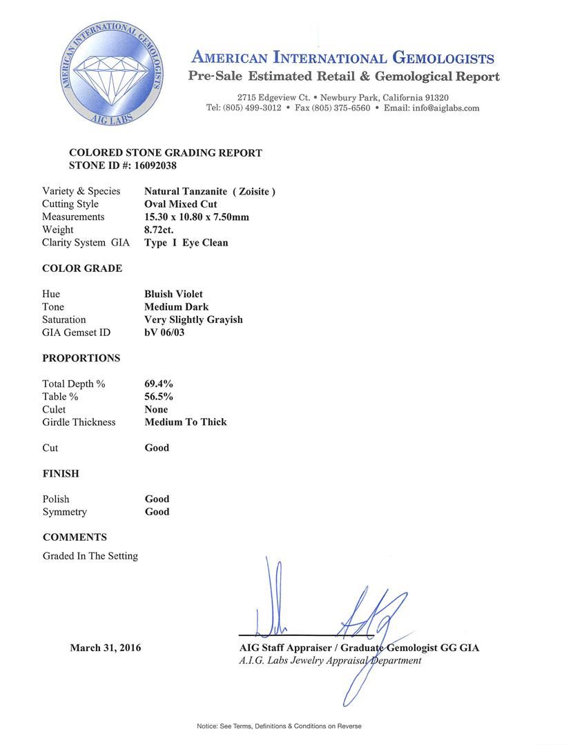 One electronically tested 14KT white gold ladies cast tanzanite and diamond ring with a bright polish finish. The featured tanzanite is set within a stylized diamond bezel supported by a ribbed under gallery, completed by a two millimeter wide band. Identified with markings of "K14". Condition is new, good workmanship. Containing: One prong set oval mixed cut natural tanzanite, measuring 15.30 x 10.80 x 7.50mm, approximate weight of 8.72ct., clarity is eye clean, type I, medium dark, very slightly grayish, bluish violet color, (GIA bV 6/3), cut is good. Transmitting light with no distortion, transparent. Colored Stone Grading Report attached. Graded in the setting. Tanzanite is a very rare gemstone that is only found in the country of Tanzania. Originally discovered in 1967. Tiffany & Company, named the stone Tanzanite. It is found in the Usumburu Mountains that border the Umba Valley of northern Tanzania. Tanzanite occurs in gray, brown, violet, blue, reddish-purple, & green. The gem is interesting because of its exceptional pleochroism. Rotated in different directions a tanzanite will exhibit multiple changes of color. Tanzanite has a low tolerance to ultrasonic cleaning, and should not be cleaned using this method. Twenty-Four prong set round brilliant cut diamonds, measuring 2.00 - 1.90 x 1.17mm (depth est.) approximate total weight of 24 Stones = 0.65ct. Graded in the setting. Clarity: SI-2 to I-2. Color: G - I Twenty-Four prong set round brilliant cut diamonds, measuring 1.60 - 1.60 x 0.96mm (depth est.) approximate total weight of 24 Stones = 0.36ct. Graded in the setting. Clarity: SI-2 to I-2. Color: G - I Twenty-Four prong set round brilliant cut diamonds, measuring 1.50 - 1.50 x 0.90mm (depth est.) approximate total weight of 24 Stones = 0.30ct. Graded in the setting. Clarity: SI-2 to I-2. Color: G - I. Total Weight of Colored Stones 8.72ct. Total Weight of Diamonds 1.31ct. Total Weight of Ring 10.90gm. AIG Appraised at $23,555.00.