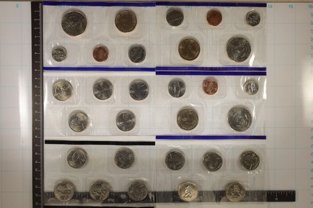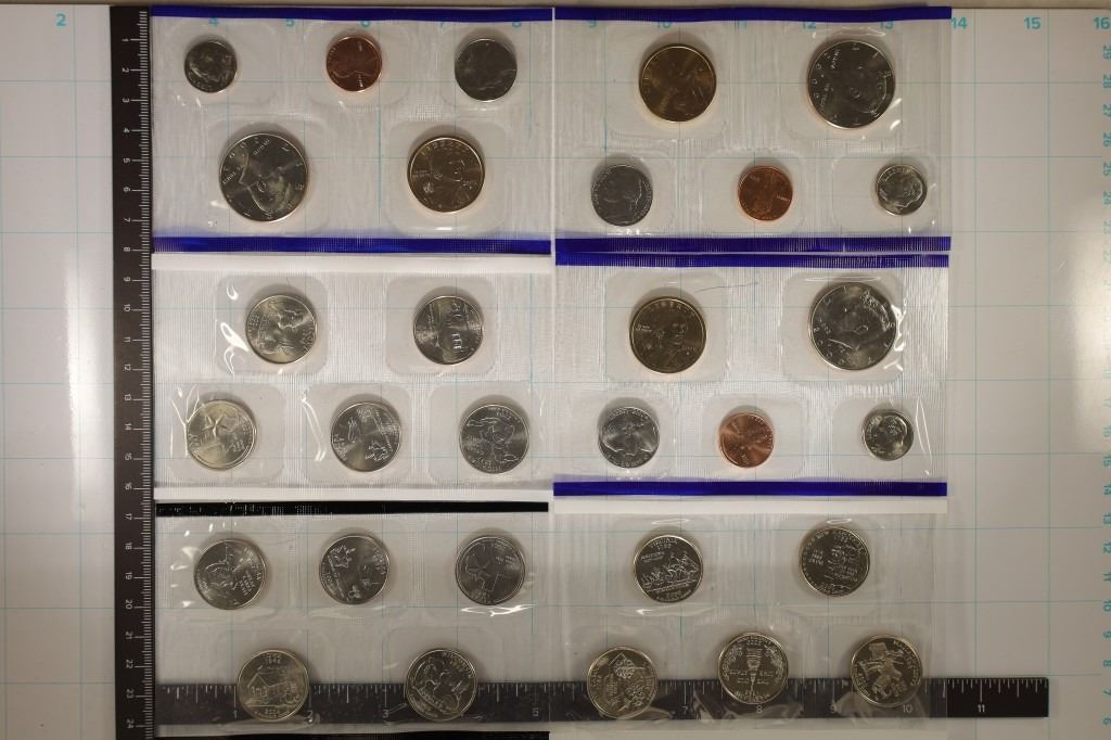 SETS 2000-P QUARTERS AND 2-SETS WITH THE SACAGAWEA DOLLAR-KENNEDY HALF DOLLAR-ROOSEVELT DIME-JEFFERSON NICKEL AND LINCOLN CENT, 2003-P SETS SACAGAWEA DOLLAR-KENNEDY HALF DOLLAR-ROOSEVELT