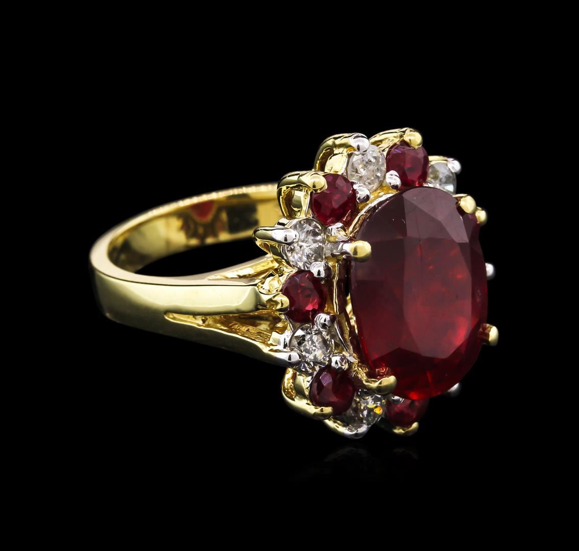 One electronically tested yellow gold ladies cast ruby & diamond ring with a bright polish and rhodium finish. Condition is new, good workmanship. The featured ruby is set within a diamond and ruby bezel supported bya ribbed under gallery, completed by a two millimeter wide band. Trademark is USA. Containing: One prong set oval mixed cut natural ruby, measuring 12.80 x 10.00 x 6.40mm, 4% bulge factor, approximate weight of 7.50ct., clarity is heavily included, type II, dark, very slightly brownish, red color, (GIA R 7/3), cut is good. Transmitting light somewhat diffusely, transparent to translucent. Naturally occurring internal & external characteristics are present. Indications of laboratory high temperature heat treatment, with glass & flux additives. Graded in the setting. Ruby has a low tolerance to rhodium plating, repolishing the surface, & ultrasonic cleaning. Seven prong set round mixed cut natural rubies approximate total weight of 1.23ct., clarity is slightly included, type II, dark, very slightly brownish, slightly purplish red color, (GIA slpR 7/3), cut is good. Transmitting light with no distortion, transparent. Naturally occurring internal & external characteristics are present. Indications of high temperature heat treatment. Measurements are an average for the group. Graded in the setting. Seven prong set round brilliant cut diamonds (depth est.) approximate total weight of 7 Stones = 0.77ct. Graded in the setting. Clarity: I-1 to I-3.Color: G - H. AIG Appraised at $4,700.00.