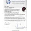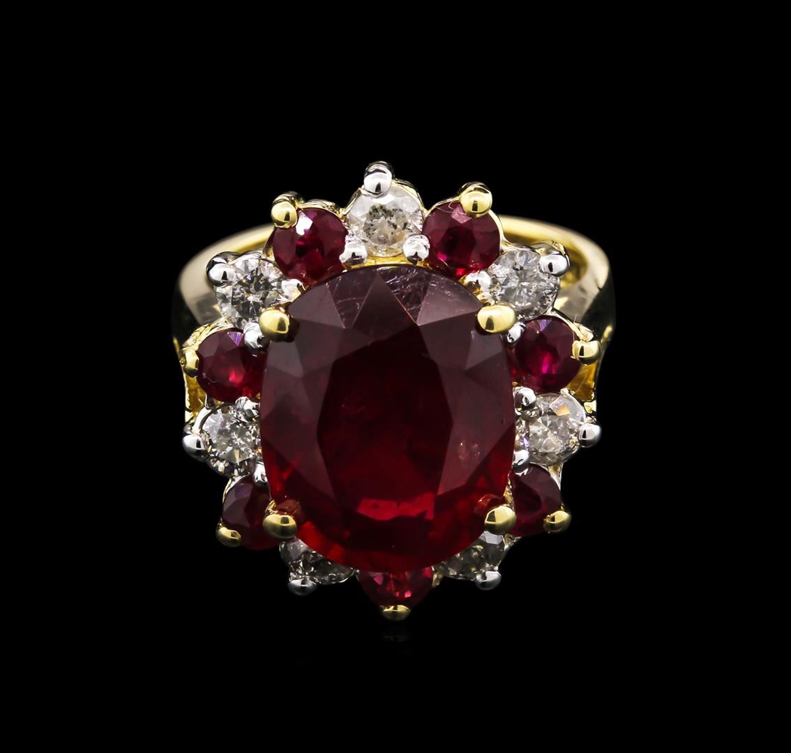 One electronically tested yellow gold ladies cast ruby & diamond ring with a bright polish and rhodium finish. Condition is new, good workmanship. The featured ruby is set within a diamond and ruby bezel supported bya ribbed under gallery, completed by a two millimeter wide band. Trademark is USA. Containing: One prong set oval mixed cut natural ruby, measuring 12.80 x 10.00 x 6.40mm, 4% bulge factor, approximate weight of 7.50ct., clarity is heavily included, type II, dark, very slightly brownish, red color, (GIA R 7/3), cut is good. Transmitting light somewhat diffusely, transparent to translucent. Naturally occurring internal & external characteristics are present. Indications of laboratory high temperature heat treatment, with glass & flux additives. Graded in the setting. Ruby has a low tolerance to rhodium plating, repolishing the surface, & ultrasonic cleaning. Seven prong set round mixed cut natural rubies approximate total weight of 1.23ct., clarity is slightly included, type II, dark, very slightly brownish, slightly purplish red color, (GIA slpR 7/3), cut is good. Transmitting light with no distortion, transparent. Naturally occurring internal & external characteristics are present. Indications of high temperature heat treatment. Measurements are an average for the group. Graded in the setting. Seven prong set round brilliant cut diamonds (depth est.) approximate total weight of 7 Stones = 0.77ct. Graded in the setting. Clarity: I-1 to I-3.Color: G - H. AIG Appraised at $4,700.00.