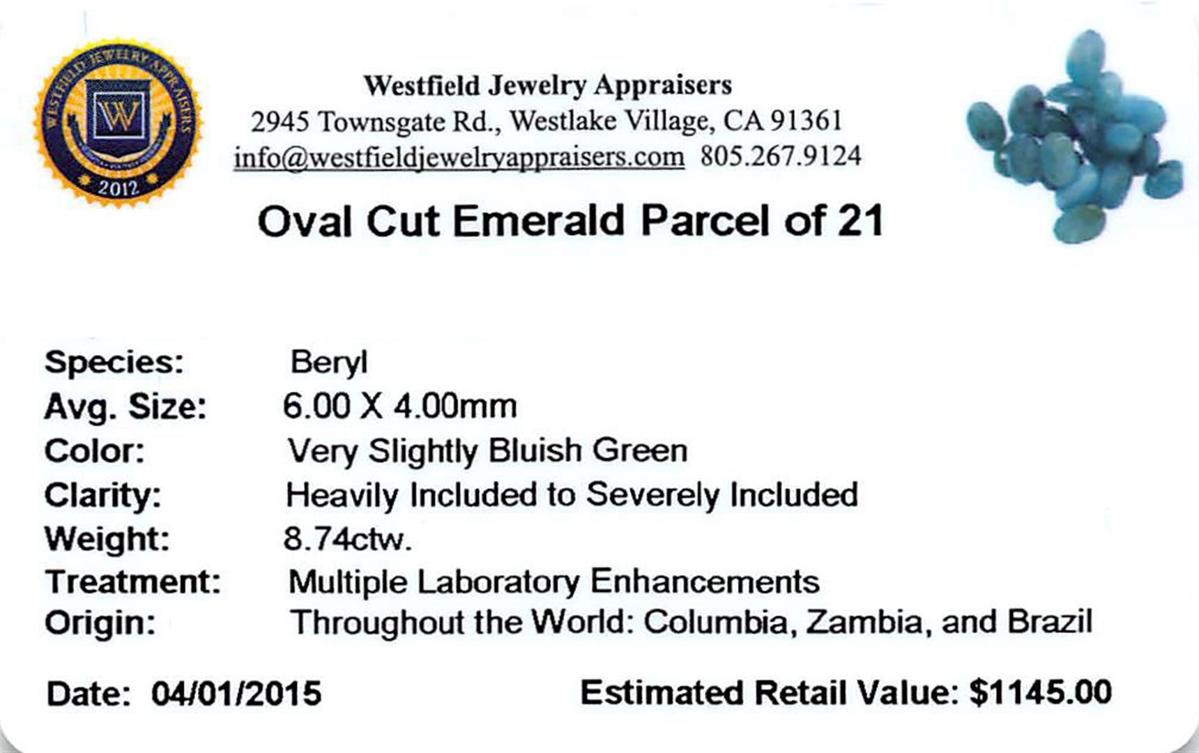 Twenty-one oval mixed cut natural emeralds exact total weight 8.74ct., clarity is heavily included, type III, medium dark, very slightly grayish, very slightly bluish green color, (GIA vslbG 6/3), cut is good. Westfield Appraised at $1,145.00.