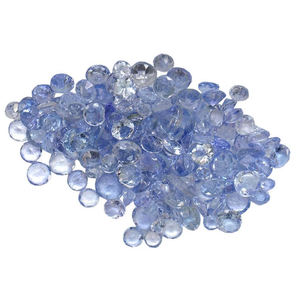 One hundred fifty round mixed cut natural tanzanites exact total weight 8.74ct., clarity is eye clean, type I, medium dark, very slightly grayish, bluish violet color, (GIA bV 6/3), cut is good. Transmitting light with no distortion, transparent. Color grade is an average for the group. Graded in the setting. Tanzanite is a very rare gemstone that is only found in the country of Tanzania. Originally discovered in 1967. Tiffany & Company, named the stone Tanzanite. It is found in the Usumburu Mountains that border the Umba Valley of northern Tanzania. Tanzanite occurs in gray, brown, violet, blue, reddish-purple, & green. The gem is interesting because of its exceptional pleochroism. Rotated in different directions a tanzanite will exhibit multiple changes of color. Tanzanite has a low tolerance to ultrasonic cleaning, and should not be cleaned using this method. Westfield Appraised.