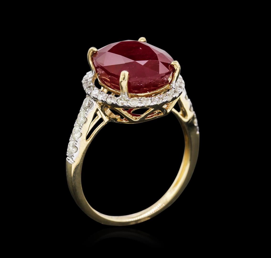 Fourteen karat (14K) yellow gold ruby and diamond ring. An oval cut ruby corundum gemstone is prong mounted in the center of the ring. Round brilliant cut diamonds accent the ring around the center gemstone. The ring is cast stamped "14K" and has a gross weight of 4.2 Grams. Diamond(s): Shape: Round Brilliant Cut. Weight: 0.63 carat. Average Clarity: I1-I2. Average Color: I-K. Symmetry: Very Good. Polish: Very Good. Gemstone(s): GemStone: Ruby Corundum. Nature: Natural. Shape: Oval, Faceted. Quantity: 1, Mounted. Weight: 8.74 carat. Dimensions: Length-12.24 mm. ; Width- 10.18 mm. Bulge: Visible. Clarity: I1, Type 3. Color: Red (5/5). Symmetry: Very Good. Color Intensity: Medium. Transparency: Transparent. Tone: Dark. Enhancements: Indications of high temperature heat treatment, with glass and flux additives. Metal(s): Metal: Gold, Stamped. Purity: 14K. Color: Yellow. Condition: Excellent. Finish: High polish. GGA Appraised.