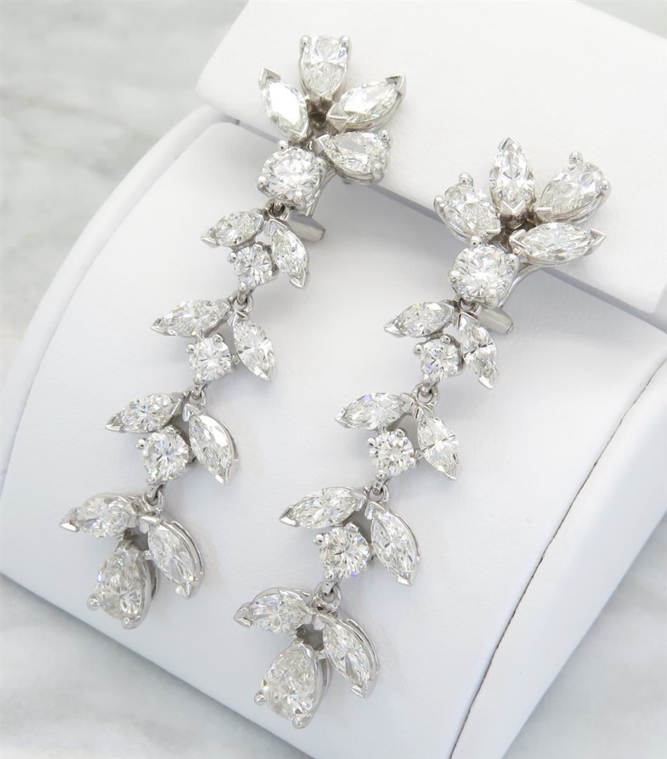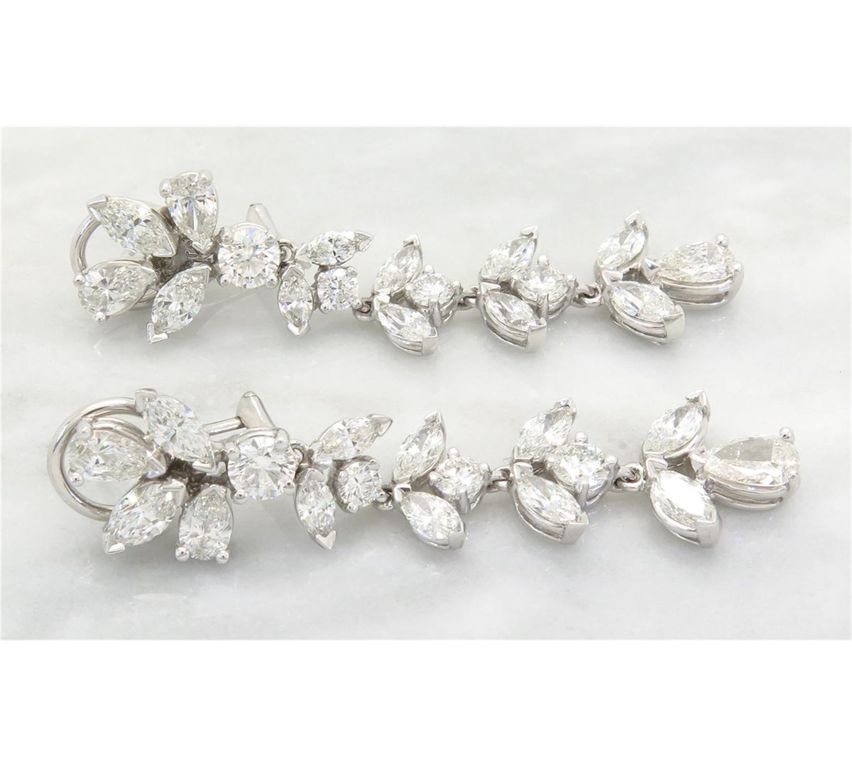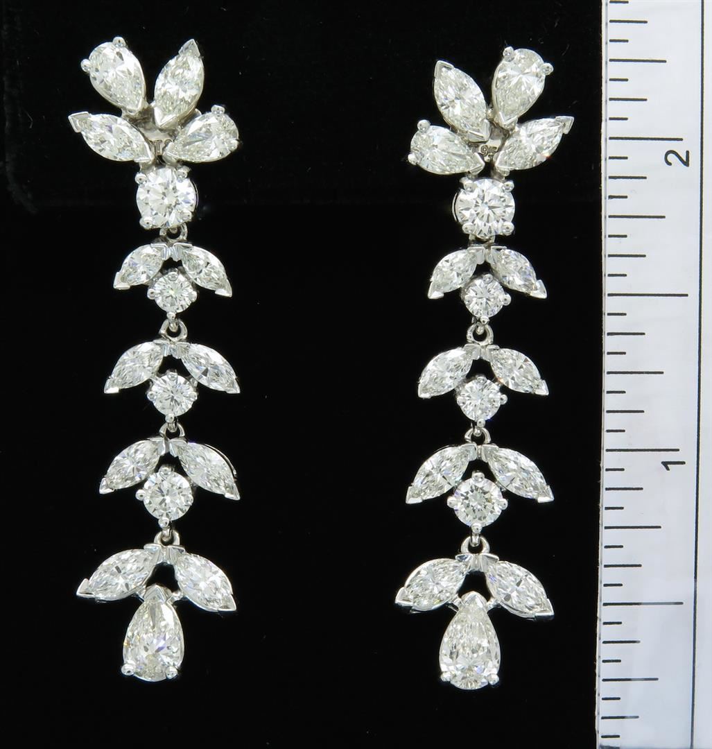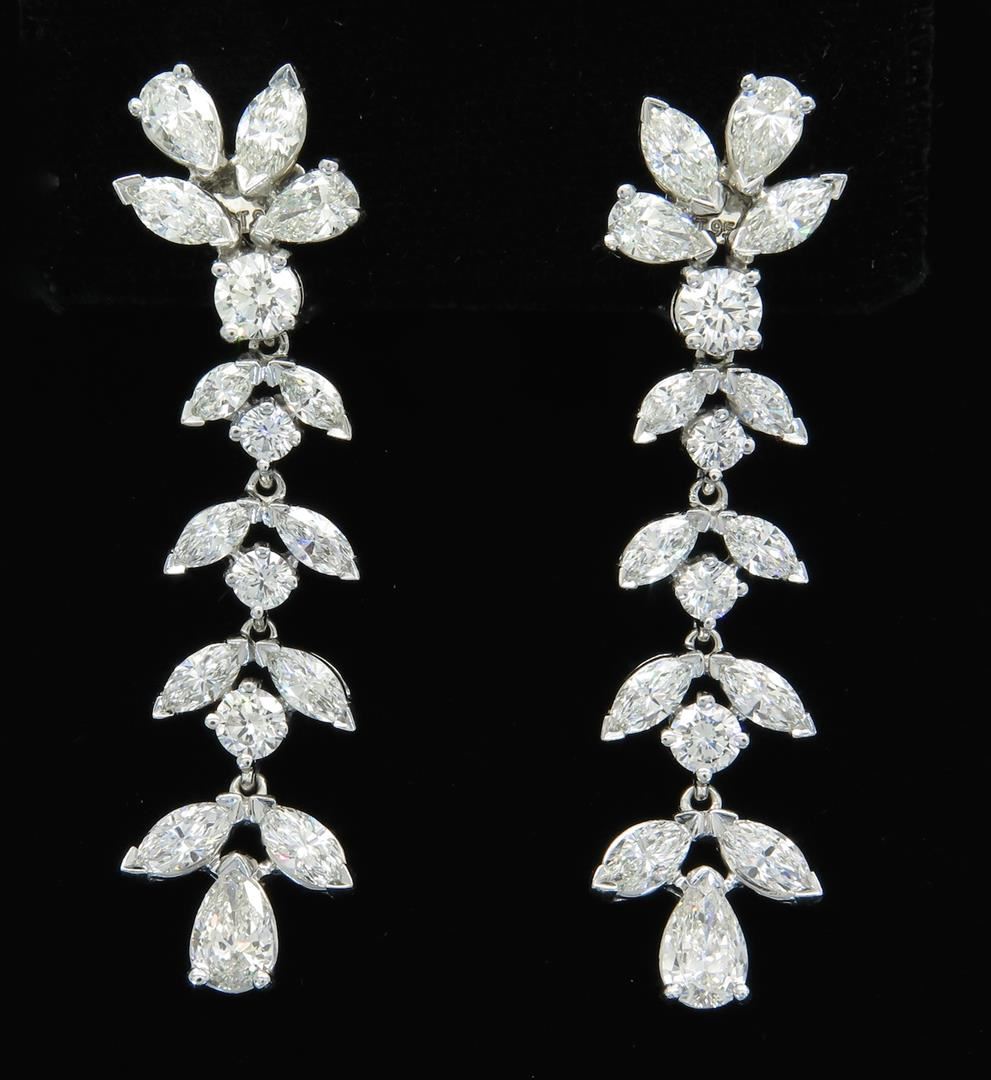 One tested pair of platinum designer Kwiat diamond earrings. Containing: 6 Pear Cut Diamonds, 8 Round Brilliant Cut Diamonds, 20 Marquise Cut Diamonds. Clarity: VS-SI, Color: G-I. Approximate total diamond weight: 8.75CTW. All diamonds are graded in the mounting unless otherwise stated. Weight of earrings 22.2 grams. The earrings have 18K white gold posts.