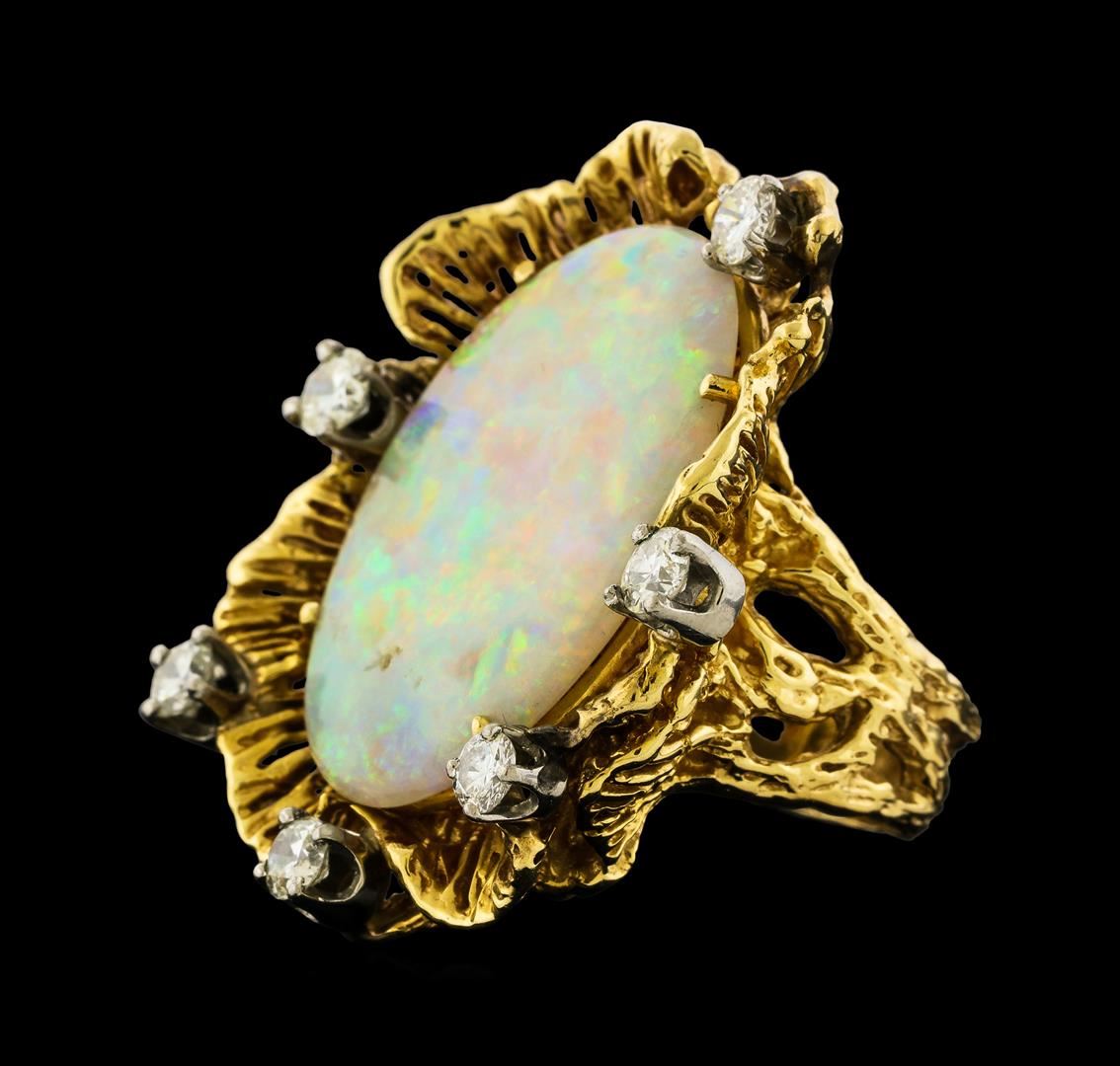 One electronically tested 14KT yellow gold ladies cast opal and diamond ring. The featured opal is set within a gold floret with six diamond accents. Bright and textured finish. Identified with markings of '14K'. Condition is good. Containing: One semi crystal opal that is cut in a oval shaped cabochon and is prong set, measuring 26.00 mm long x 18.00 mm wide, and 3.00 mm thick and the approximate weight is 8.75 carats. The opal has a bright, multicolor play of color (fire) in a flashfire pattern; a low dome; a good cut; slightly included; consistent in its brightness and pattern; and is not directional. Graded in the setting. Six prong set round brilliant and transitional cut diamonds, measuring 3.40 x 3.90 x 0.00mm (depth est.) approximate total weight of 6 Stones = 1.07ct. Graded in the setting. Clarity VS-2 to SI-2. Color: G - I. Total Weight of Diamonds 1.07ct.. Total Weight of Opals 8.75ct.. Total Weight of Ring 24.57gm. AIG Appraised at $11,750.00.