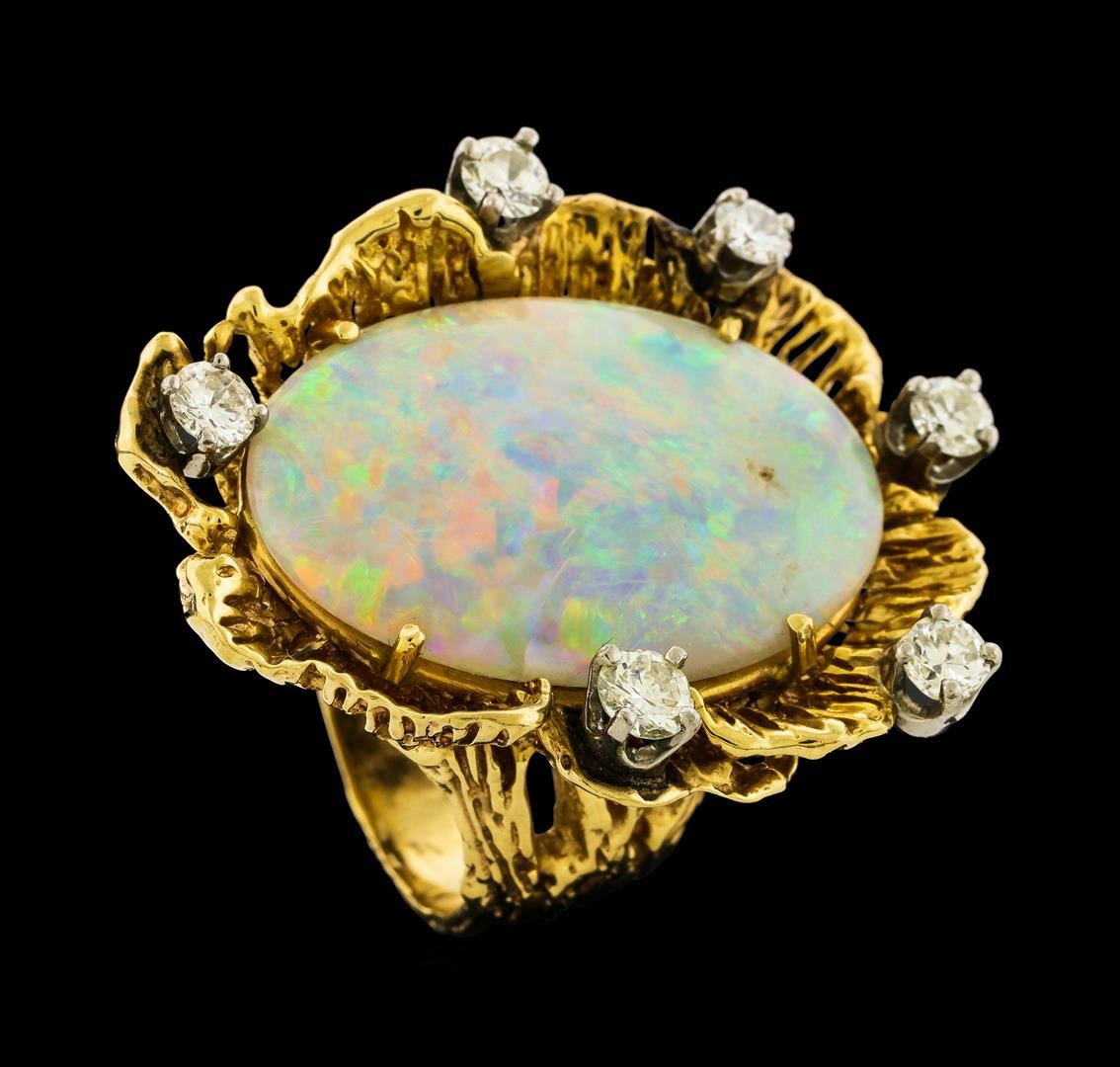 One electronically tested 14KT yellow gold ladies cast opal and diamond ring. The featured opal is set within a gold floret with six diamond accents. Bright and textured finish. Identified with markings of '14K'. Condition is good. Containing: One semi crystal opal that is cut in a oval shaped cabochon and is prong set, measuring 26.00 mm long x 18.00 mm wide, and 3.00 mm thick and the approximate weight is 8.75 carats. The opal has a bright, multicolor play of color (fire) in a flashfire pattern; a low dome; a good cut; slightly included; consistent in its brightness and pattern; and is not directional. Graded in the setting. Six prong set round brilliant and transitional cut diamonds, measuring 3.40 x 3.90 x 0.00mm (depth est.) approximate total weight of 6 Stones = 1.07ct. Graded in the setting. Clarity VS-2 to SI-2. Color: G - I. Total Weight of Diamonds 1.07ct.. Total Weight of Opals 8.75ct.. Total Weight of Ring 24.57gm. AIG Appraised at $11,750.00.
