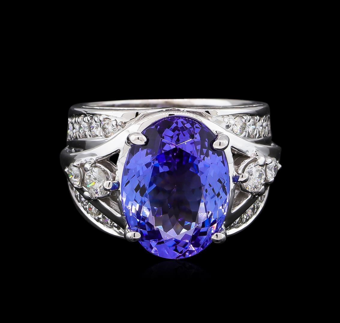 One electronically tested 14KT white gold lady's cast fashion ring with a tapered cathedral shank with a bright polish finish. The featured lady's ring has a shank measuring 4.49 millimeters wide. Condition is new, good workmanship. Containing: One prong set oval modified brilliant cut natural tanzanite, measuring 14.61 x 10.84 x 7.20mm, 8%. bulge factor, approximate weight of 8.75ct., clarity is eye clean, type I, medium, moderately strong, bluish violet color, (GIA bV 5/4), cut is excellent. Transmitting light with no distortion, transparent. Colored gemstones are presumed to have been subjected to commonly used enhancement processes. Graded in the setting. Two prong set round brilliant cut diamonds, measuring 3.20 - 3.10 x 1.95mm (depth est.) approximate total weight of 2 Stones = 0.24ct. Graded in the setting. Clarity: SI-2 to I-1. Color: H - I. Cut Good Two prong set round brilliant cut diamonds, measuring 2.40 - 2.30 x 1.46mm (depth est.) approximate total weight of 2 Stones = 0.10ct. Graded in the setting. Clarity: VS-2 to SI-1. Color: G - H. Cut Very Good Twenty prong set round brilliant cut diamonds, measuring 1.90 - 1.80 x 1.17mm (depth est.) approximate total weight of 20 Stones = 0.50ct. Graded in the setting. Clarity: VS-2 to SI-2. Color: H - I. Cut Good. Total Weight of Colored Stones 8.75ct. Total Weight of Diamonds 0.84ct. Total Weight of Ring 11.30gm. GAS Appraised.