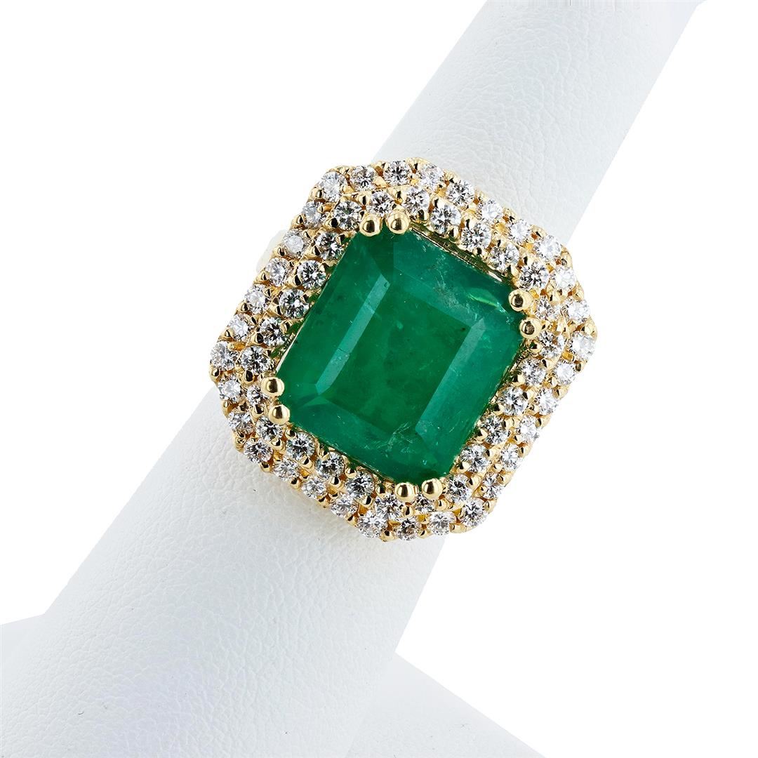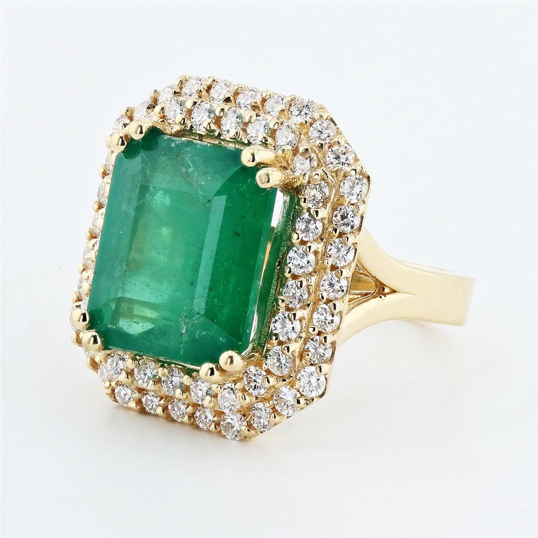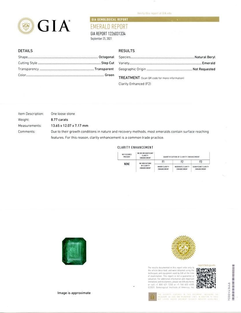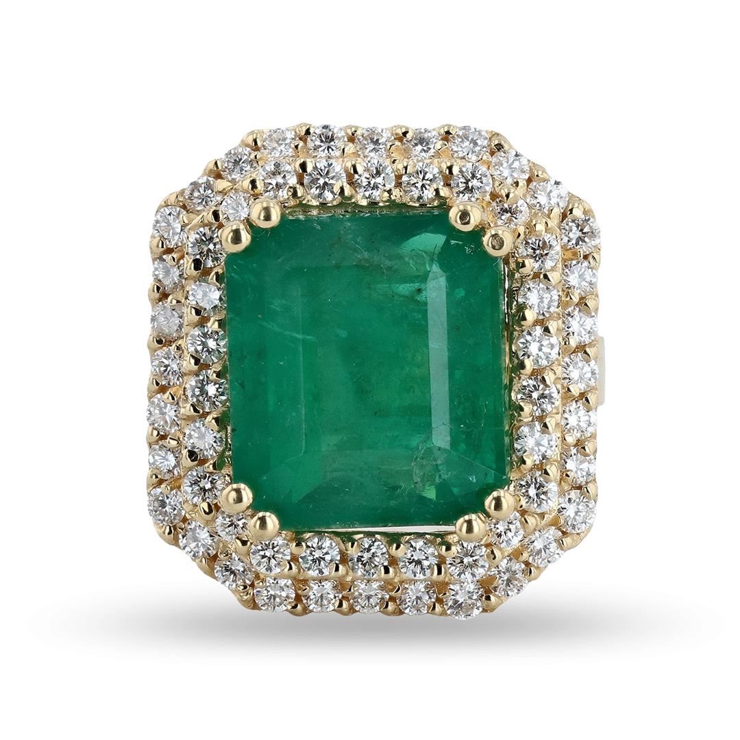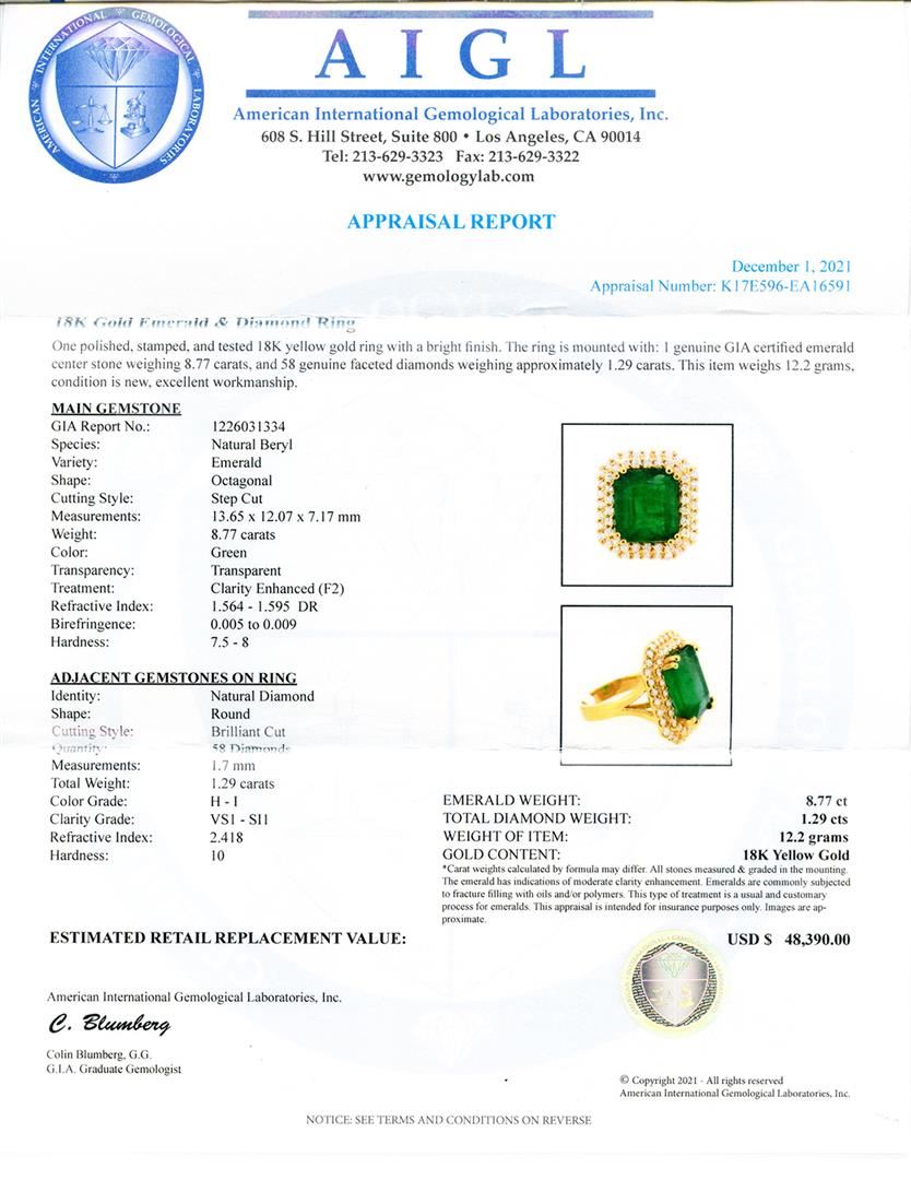 One polished, stamped, and tested 18K yellow gold ring with a bright finish. The ring is mounted with: 1 genuine GIA certified emerald center stone weighing 8.77 carats, and 38 genuine faceted diamonds weighing approximately 1.29 carats. This tem weighs 1