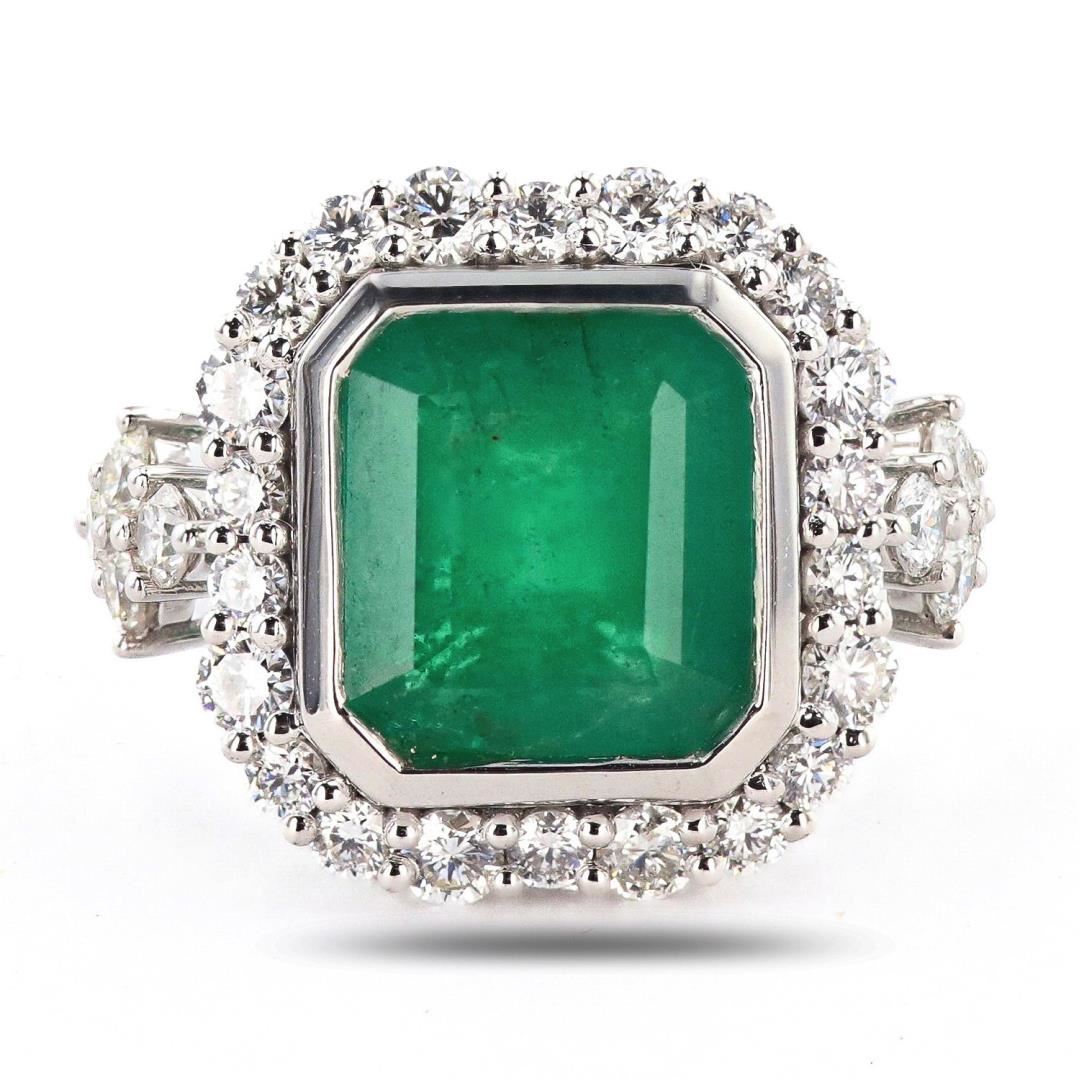 One polished. stamped, and tested platinum ring marked Oscar Friedman. The ring is mounted with: 1 genuine GIA certified emerald center stone weighing approximately 8.77 carats, and 30 genuine round diamonds weighing approximately 1.91 carats. This item weighs 13.6 grams, condition is new, excellent workmanship. #MAIN GEMSTONE# GIA Report No.: 2223970813; Species: Natural Beryl; Variety: Emerald; Shape: Octagonal; Cutting Style: Step Cut; Measurements: 12.43 x 11.33 x 8.08mm; Weight: 8.77 carats; Color: Green; Transparency: Transparent to Semi Transparent; Treatment: Clarity Enhanced (F2); Refractive Index: 1.564 - 1.595 DR; Birefringence: 0.005 to 0.009; Hardness: 7.5 - 8 #ADJACENT GEMSTONES ON RING# Identity: Natural Diamond; Shape: Round; Cutting Style: Brilliant Cut; Quantity: 30 Diamonds; Measurements: 2.2 - 3.0mm; Total Weight: 1.91 carats; Color Grade: F-G; Clarity Grade: VS1 - SI1; Refractive Index: 2.417; Hardness: 10; EMERALD WEIGHT: 8.77 ct; TOTAL DIAMOND WEIGHT: 1.91 cts; WEIGHT OF ITEM: 13.6 grams; METAL: Platinum #Size: 6 3/4