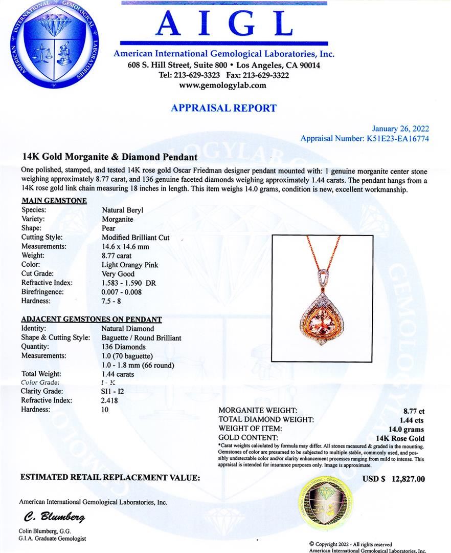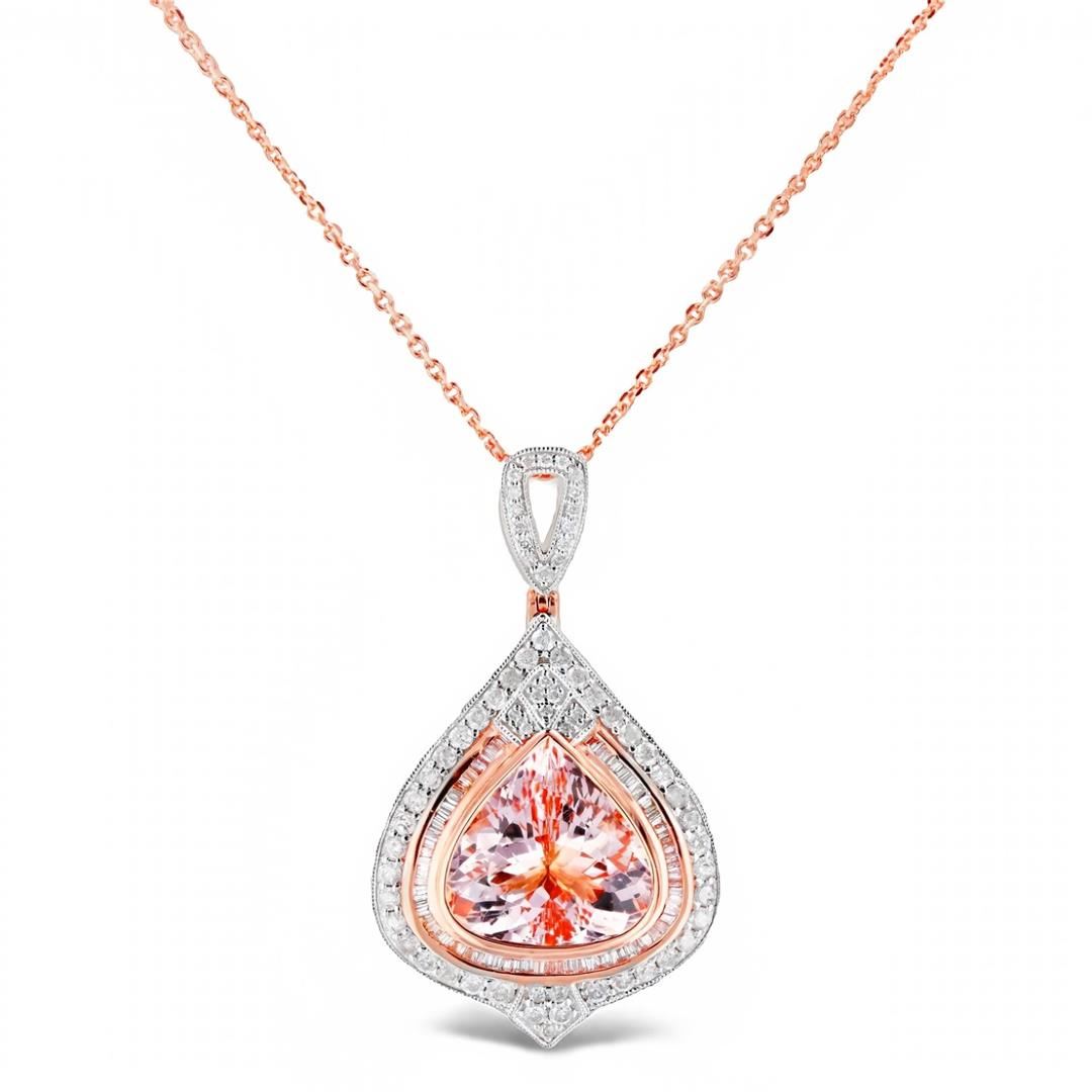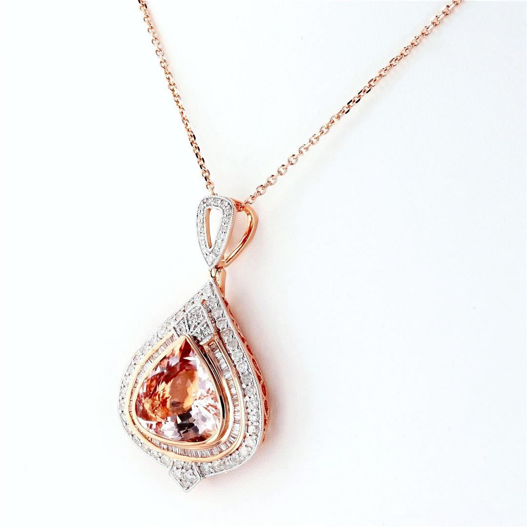 8.77ct Morganite and 1.44ctw Diamond 14K Rose Gold Pendant/Necklace. Please see Photos and Description for all available information. This necklace was designed to have the perfect balance between simplicity and elegance. The pendant features a 8.77ct Morganite gemstone and 136 round diamonds. It has a total diamond weight of 1.44ctw and is set in 14K Rose Gold. The pendant is suspended from an 18-inch rose gold chain.