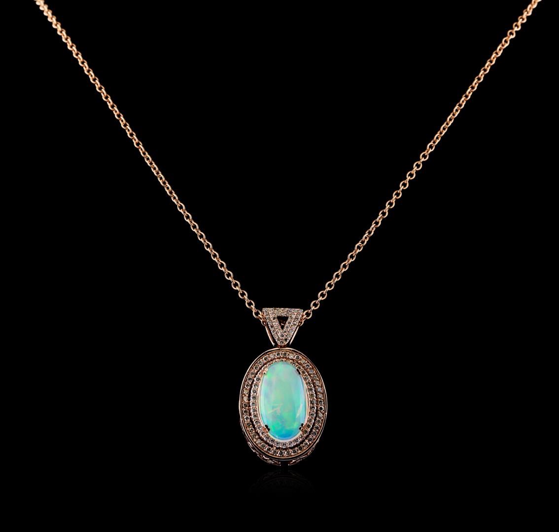 One electronically tested 14KT rose gold ladies cast & assembled opal and diamond pendant with chain. The pendant features an opal set within tiered diamond bezels supported by a diamond set lattice under gallery, completed by a stylized diamond accented bail. The pendant is supported by a twenty inch length 14KT rose gold 2.0mm link chain, terminating in a lobster claw clasp. Bright polish finish. Condition is new, good workmanship. Containing: One crystal opal that is cut in a oval shaped cabochon and is prong set, measuring 20.75 mm long x 12.28 mm wide, and 5.52 mm thick and the approximate weight is 8.77 carats. The opal has a bright, multicolor play of color (fire) in a flashfire pattern; a medium dome; a good cut; slightly included; minor dull spot in its brightness and pattern; and is not directional. Graded in the setting. Ninety-Four prong set round brilliant cut diamonds, measuring 1.60 - 1.50 x 0.93mm (depth est.) approximate total weight of 94 Stones = 1.37ct. Faint brown secondary color throughout. Graded in the setting. Clarity: SI-1 to I-1. Color: I - K Thirty-Seven prong set round brilliant cut diamonds, measuring 1.20 - 1.20 x 0.72mm (depth est.) approximate total weight of 37 Stones = 0.28ct. Faint brown secondary color throughout. Graded in the setting. Clarity: SI-1 to I-1. Color: I - K. Total Weight of Diamonds 1.65ct. Total Weight of Opals 8.77ct. Total Weight of Pendant With Chain 17.28gm. AIG Appraised at $9,960.00.