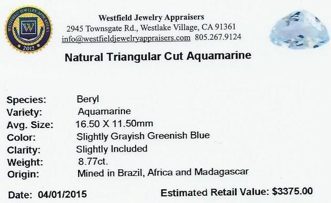 One triangle cut natural aquamarine exact weight 8.77ct., clarity is slightly included, type I, medium light, very slightly grayish, very slightly greenish blue color, (GIA vslgB 4/3), cut is good. Westfield Appraised at $3,375.00.