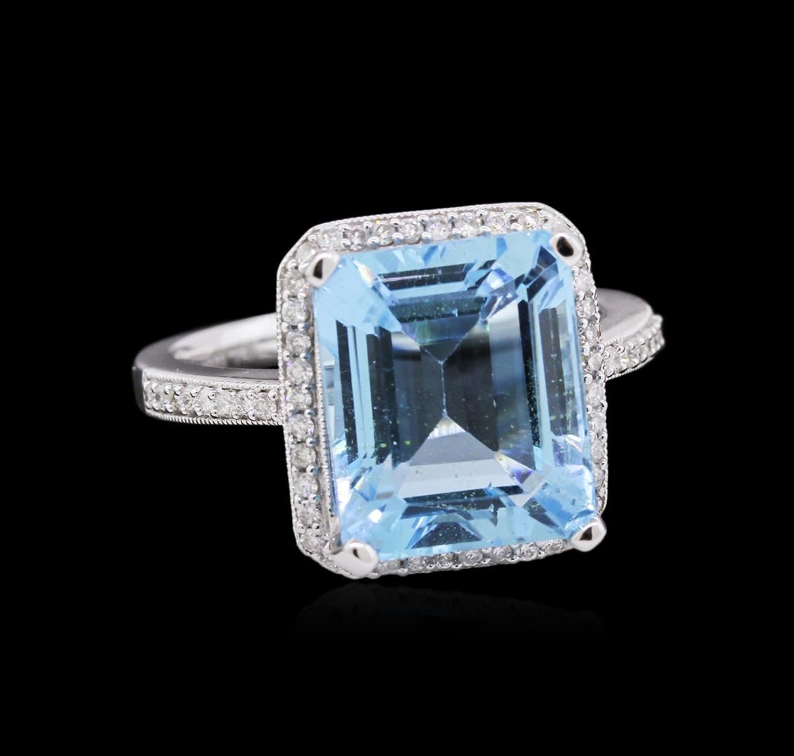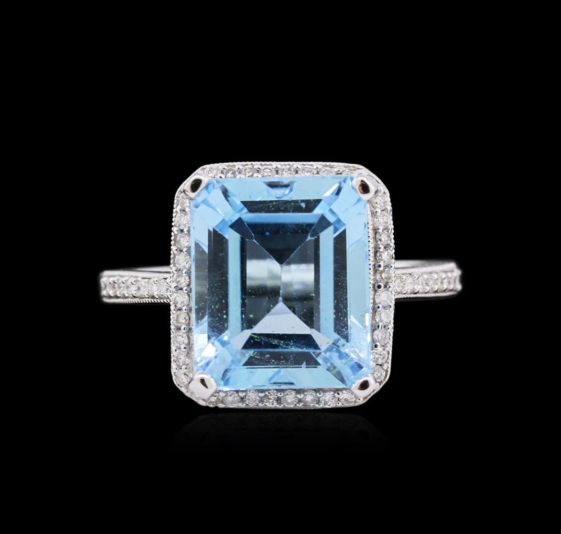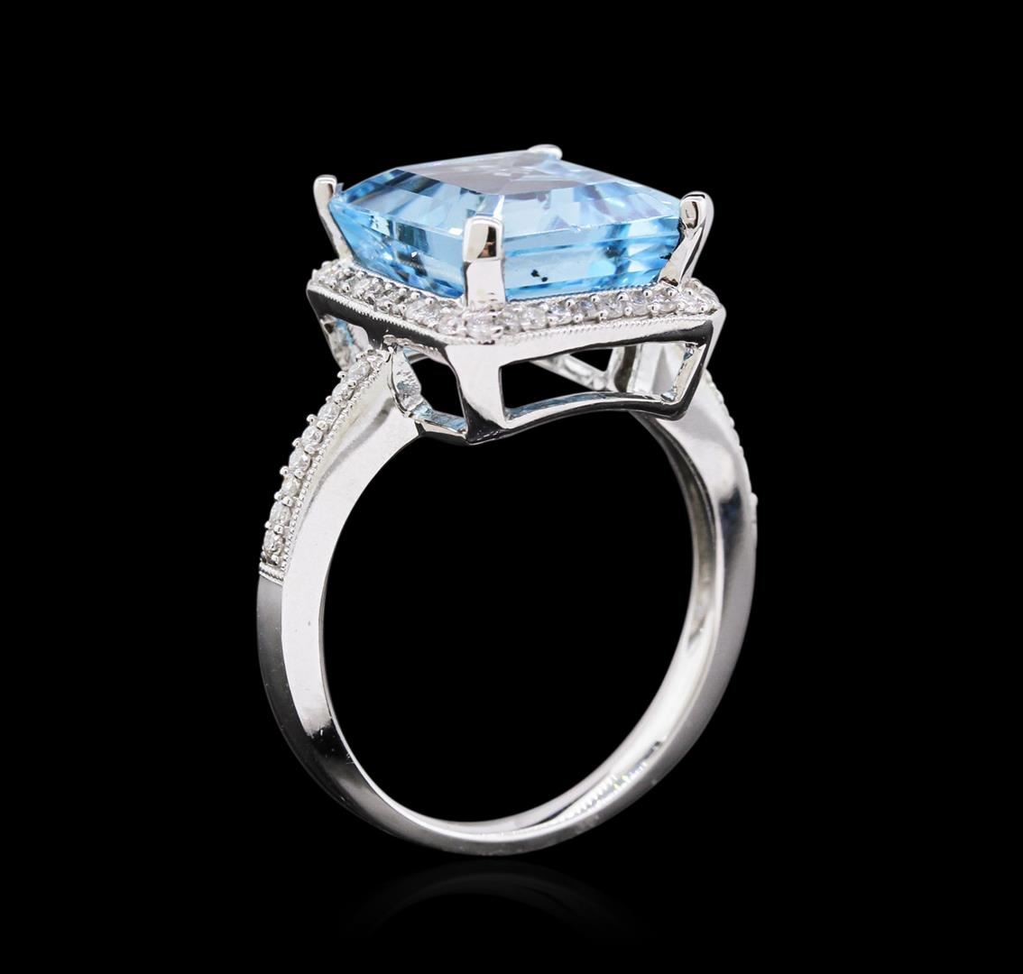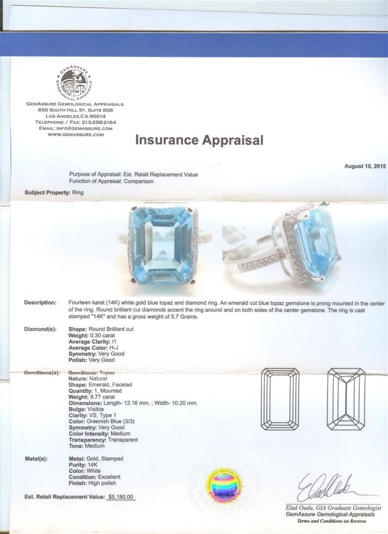 One 14KT white gold blue topaz and diamond ring. An emerald cut blue topaz gemstone is prong mounted in the center of the ring. Round brilliant cut diamonds accent the ring around the center gemstone and on both sides. The ring is cast stamped "14K" and has a gross weight of 5.7 Grams. Diamond(s): Shape: Round Brilliant Cut. Weight: 0.30 carat. Average Clarity: I1. Average Color: H-J. Symmetry: Very Good. Polish: Very Good. GemStone(s): Topaz. Nature: Natural. Shape: Emerald, Faceted. Quantity: 1, Mounted. Weight: 8.77 carat. Dimensions: Length - 12.16 mm. ; Width - 10.20 mm. Bulge: Visible. Clarity: VS, Type 1. Color: Greenish Blue (3/3). Symmetry: Very Good. Color Intensity: Medium. Transparency: Transparent. Tone: Medium. Metal(s): Metal: Gold, Stamped. Purity: 14K. Color: White. Condition: Excellent. Finish: High polish. GGA Appraised at $5,180.00.