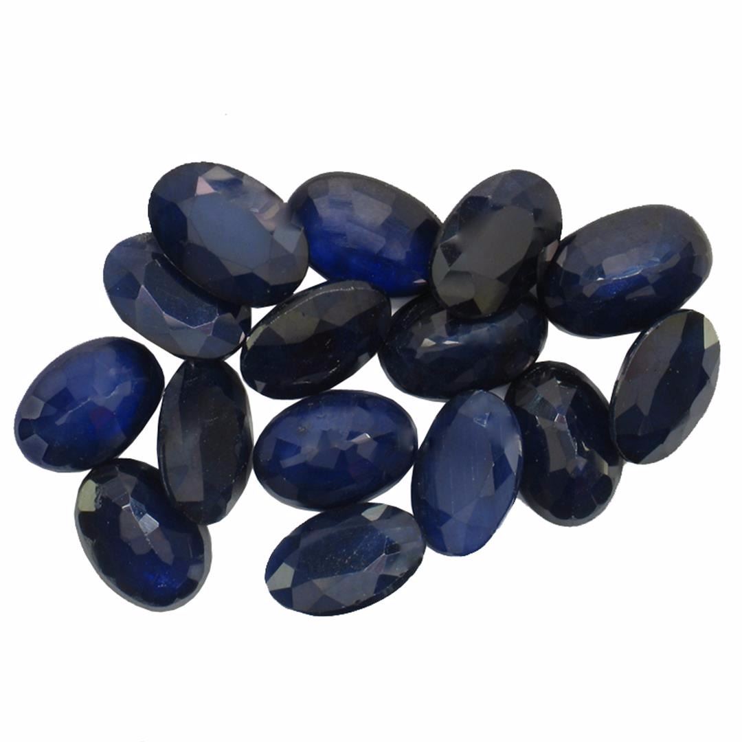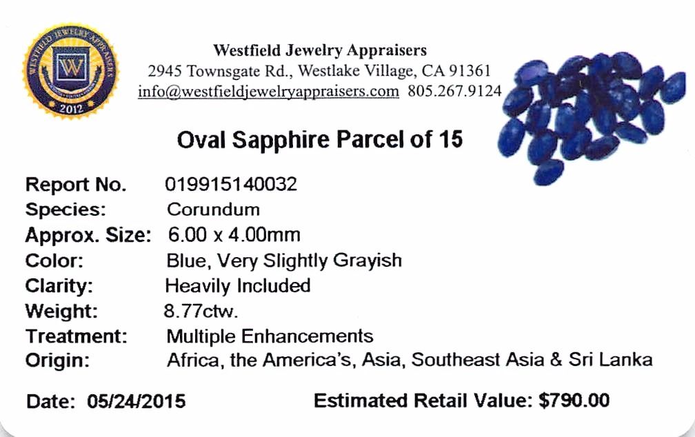 Fifteen oval mixed cut natural blue sapphires, measuring 6.00 x 4.00 x 0.00mm, exact total weight 8.77ct., clarity is heavily included, type II, dark, very slightly grayish, blue color, (GIA B 7/3), cut is good. Indications of multiple laboratory enhancements, including high temperature heat treatment. Westfield Appraised at $790.00.