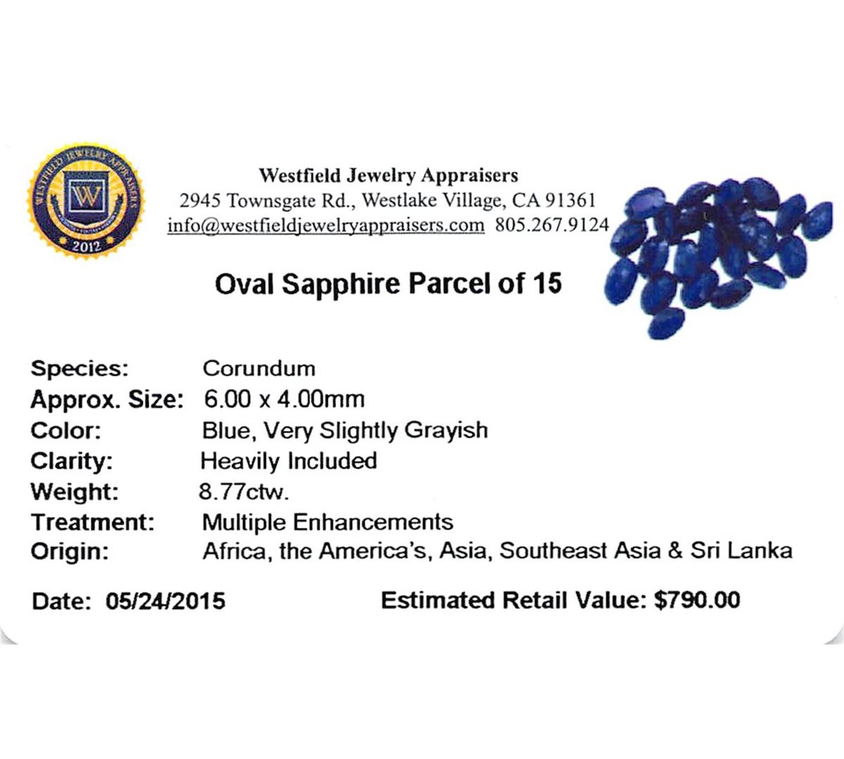 Fifteen oval mixed cut natural blue sapphires, measuring 6.00 x 4.00 x 0.00mm, exact total weight 8.77ct., clarity is heavily included, type II, dark, very slightly grayish, blue color, (GIA B 7/3), cut is good. Indications of multiple laboratory enhancements, including high temperature heat treatment. Westfield Appraised at $790.00.
