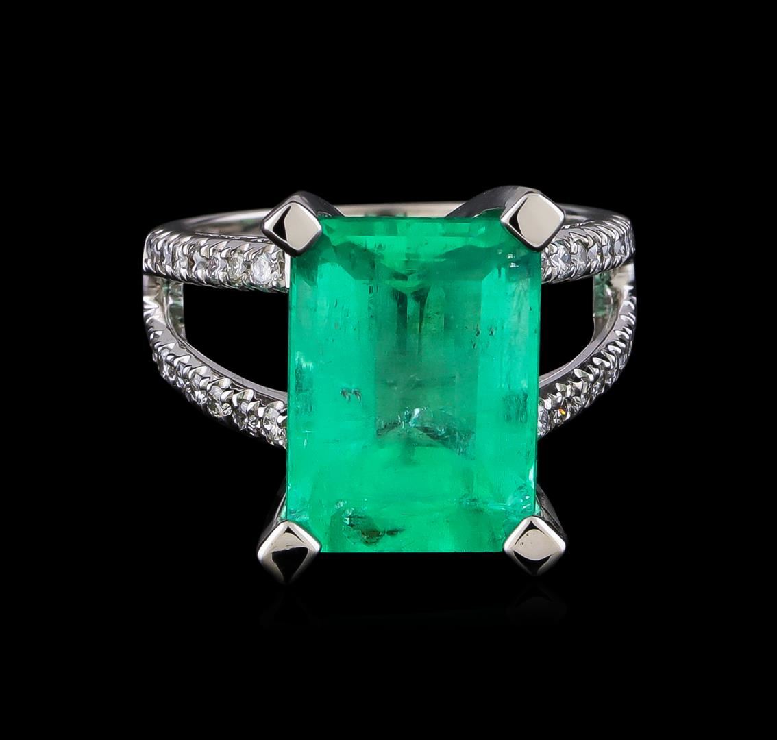 One electronically tested 14KT white gold lady's cast fashion ring with a split shank cathedral with a bright polish finish. The featured lady's ring has a shank measuring 3.02 millimeters in width. Identified with markings of "14K". Condition is new, good workmanship. Containing: One prong set emerald step cut natural emerald, measuring 14.04 x 10.23 x 7.80mm, (depth est.) 5%. bulge factor, approximate weight of 8.78ct., clarity is moderately included, medium light, moderately strong, green color, (GIA G 4/4), cut is good. Transmitting light with a minimum of distortion, transparent. Indications of oil residue. Naturally occurring internal & external characteristics are present. Colored gemstones are presumed to have been subjected to commonly used enhancement processes. Graded in the setting. Thirty-Two prong set round brilliant cut diamonds, measuring 1.57 - 1.52 x 0.97mm (depth est.) approximate total weight of 32 Stones = 0.45ct. Graded in the setting. Clarity: VS-2 to SI-1. Color: H - I. Cut Good Sixteen bead set round brilliant cut diamonds, measuring 1.40 - 1.35 x 0.86mm (depth est.) approximate total weight of 16 Stones = 0.16ct. Graded in the setting. Clarity: VS-2 to SI-2. Color: H - I. Cut Good. Total Weight of Colored Stones 8.78ct. Total Weight of Diamonds 0.61ct. Total Weight of Ring 8.20gm. GAS Appraised at $17,700.00.
