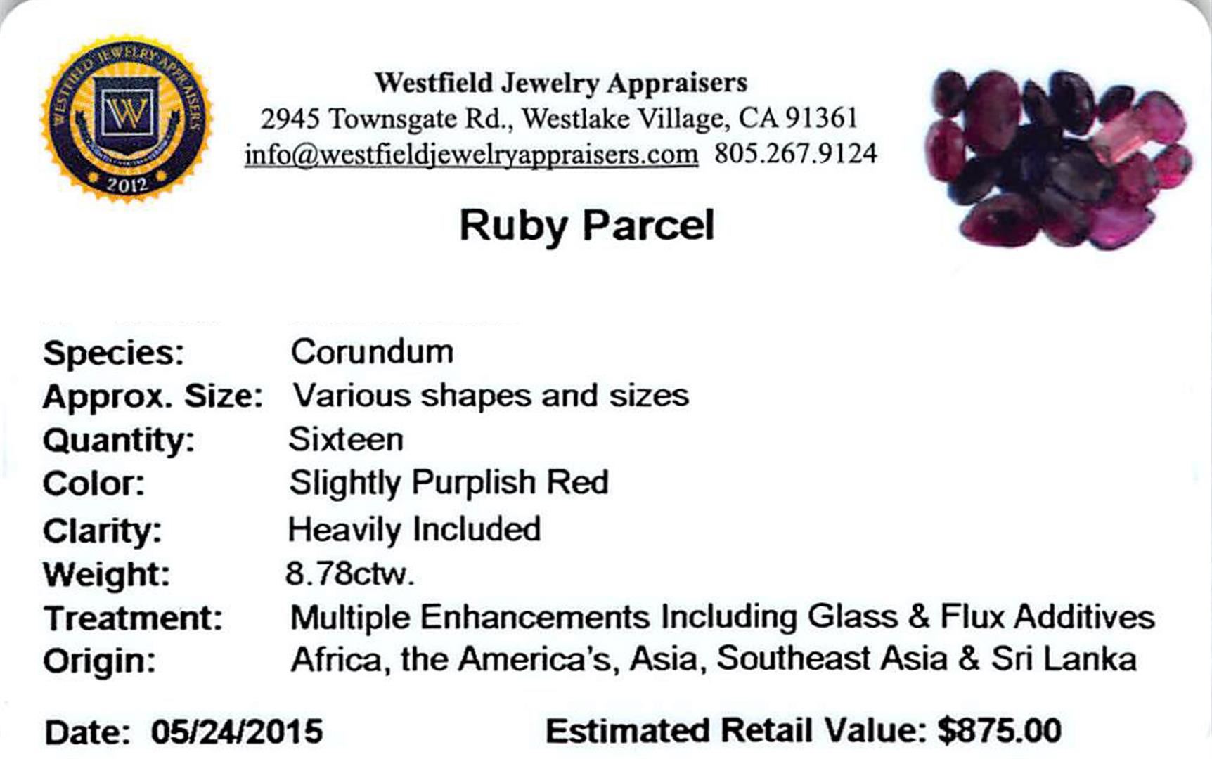 Sixteen various shapes & sizes cut natural rubies exact total weight 8.78ct., clarity is heavily included, type II, dark, very slightly brownish, slightly purplish red color, (GIA slpR 7/3), cut is good. Transmitting light somewhat diffusely, transparent to translucent. Naturally occurring internal & external characteristics are present. Indications of laboratory high temperature heat treatment, with glass & flux additives. Ruby has a low tolerance to rhodium plating, repolishing the surface, & ultrasonic cleaning. Westfield Appraised at $875.00.