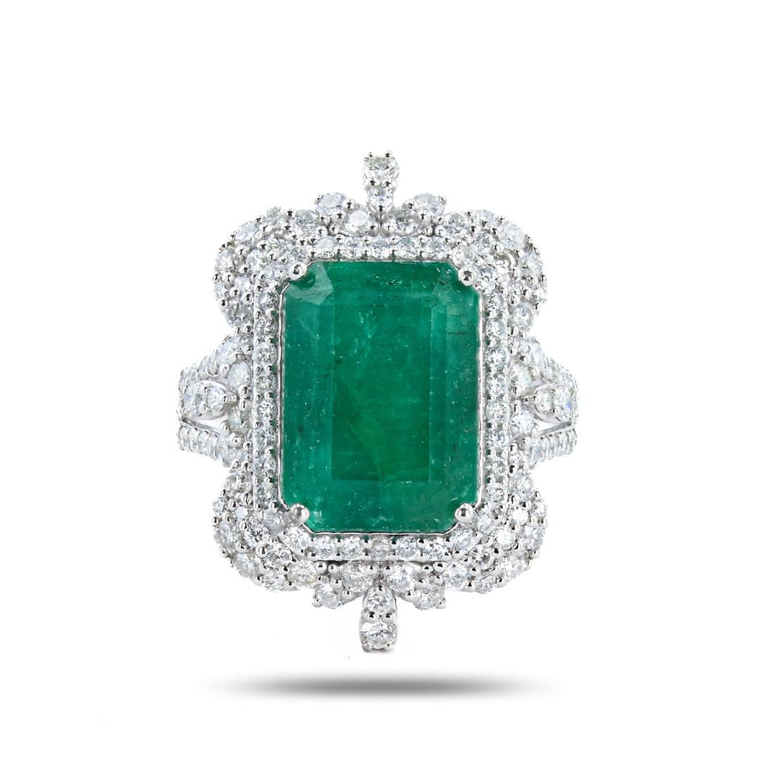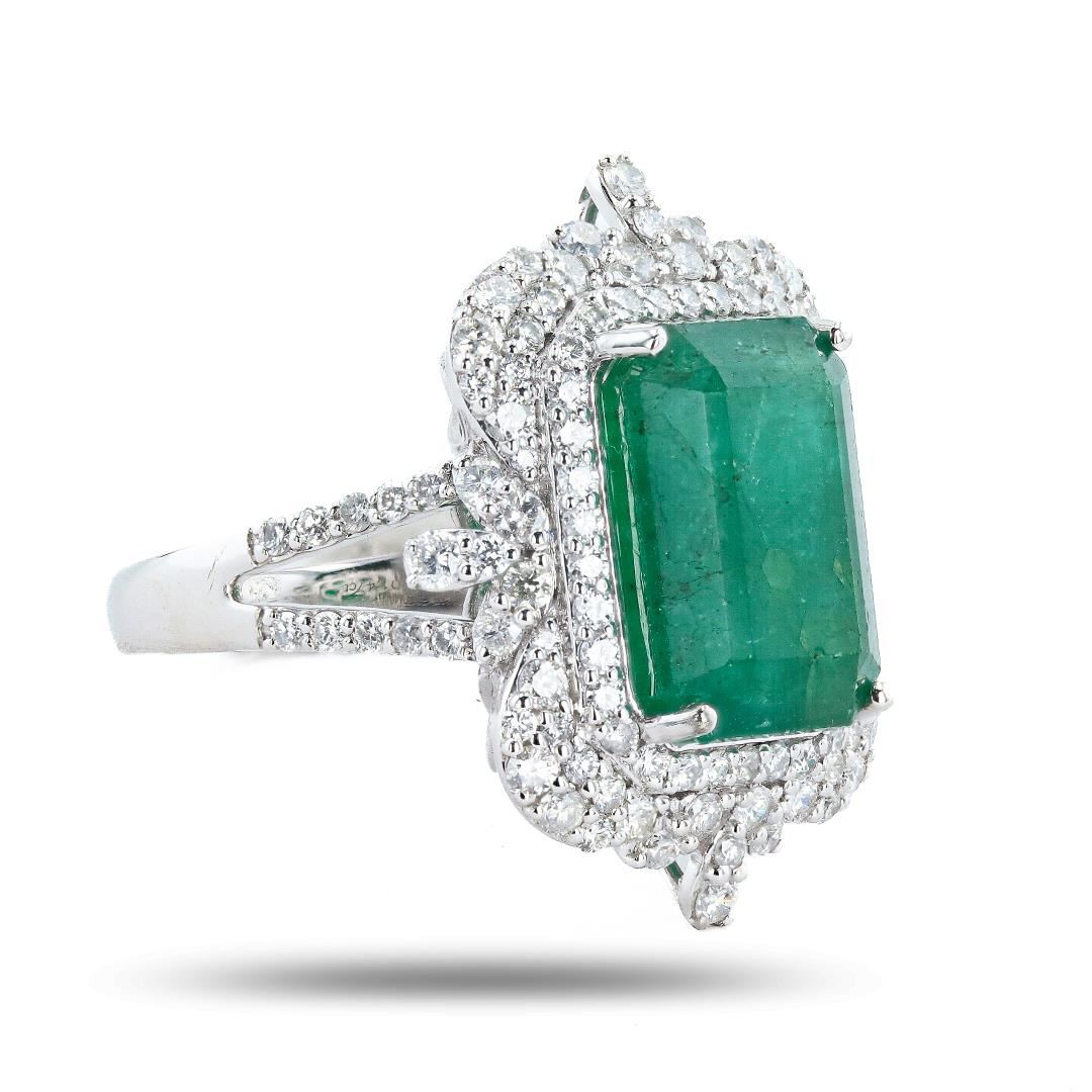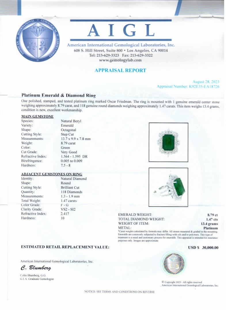 One polished, stamped, and tested platinum ring marked Oscar Friedman. The ring is mounted with 1 genuine emerald center stone weighing approximately 8.79 carat, and 118 genuine round diamonds weighing approximately 1.47 carats. This item weighs 13.4 grams, condition is new, excellent workmanship. #MAIN GEMSTONE# Species: Natural Beryl; Variety: Emerald; Shape: Octagonal; Cutting Style: Step Cut; Measurements: 13.7 x 9.9 x 7.8mm; Weight: 8.79 carat; Color: Green; Cut Grade: Very Good; Refractive Index: 1.564 - 1.595 DR; Birefringence: 0.005 to 0.009; Hardness: 7.5 - 8 #ADJACENT GEMSTONES ON RING# Identity: Natural Diamond; Shape: Round; Cutting Style: Brilliant Cut; Quantity: 118 Diamonds; Measurements: 1.3 - 1.9mm; Total Weight: 1.47 carats; Color Grade: F-G; Clarity Grade: VS2-SI2; Refractive Index: 2.417; Hardness: 10; EMERALD WEIGHT: 8.79 ct; TOTAL DIAMOND WEIGHT: 1.47 cts; WEIGHT OF ITEM: 13.4 grams; METAL: Platinum #Size: 7 1/4