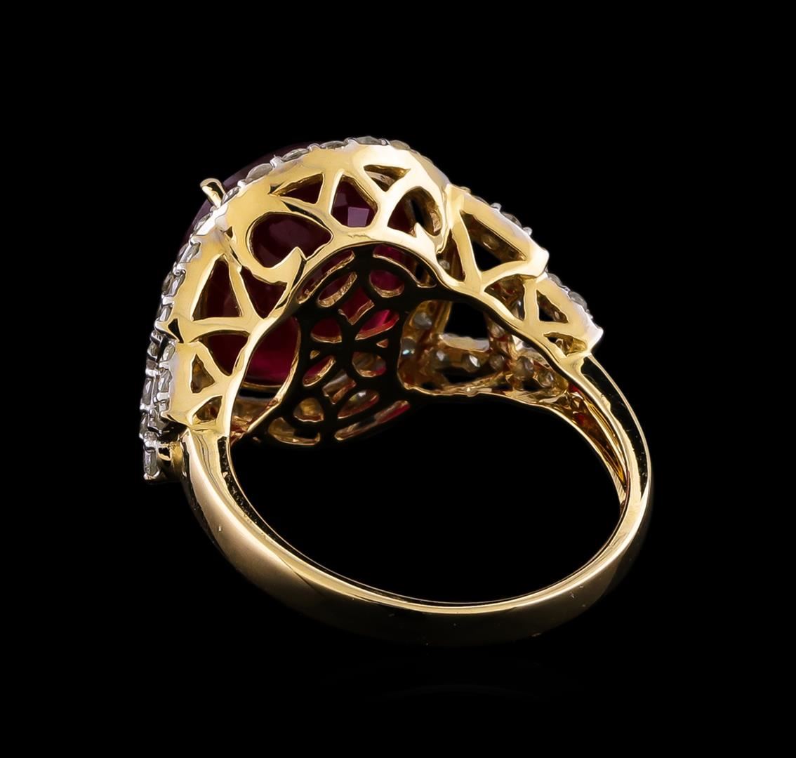 One electronically tested 14KT yellow gold ladies cast ruby and diamond ring. The featured ruby is set within a diamond bezel supported by an elaborate lattice under gallery and stylized diamond set shoulders, completed by a two millimeter wide band. Bright polish finish with rhodium accents. Trademark is Orianne. Identified with markings of "14K". Condition is new, good workmanship. Containing: One prong set oval mixed cut natural ruby approximate weight of 8.79ct., clarity is heavily included, type II, medium dark, very slightly brownish, slightly purplish red color, (GIA slpR 6/3), cut is good. Transmitting light somewhat diffusely, transparent to translucent. Naturally occurring internal & external characteristics are present. Indications of laboratory high temperature heat treatment, with glass & flux additives. Graded in the setting. Ruby has a low tolerance to rhodium plating, repolishing the surface, & ultrasonic cleaning. Sixty prong set round brilliant cut diamonds approximate total weight of 60 Stones = 0.87ct. Graded in the setting. Clarity: I-1 to I-3. Color: I - K. Total Weight of Colored Stones 8.79ct. Total Weight of Diamonds 0.87ct. Total Weight of Ring 5.49gm. AIG Appraised at $3,945.00.