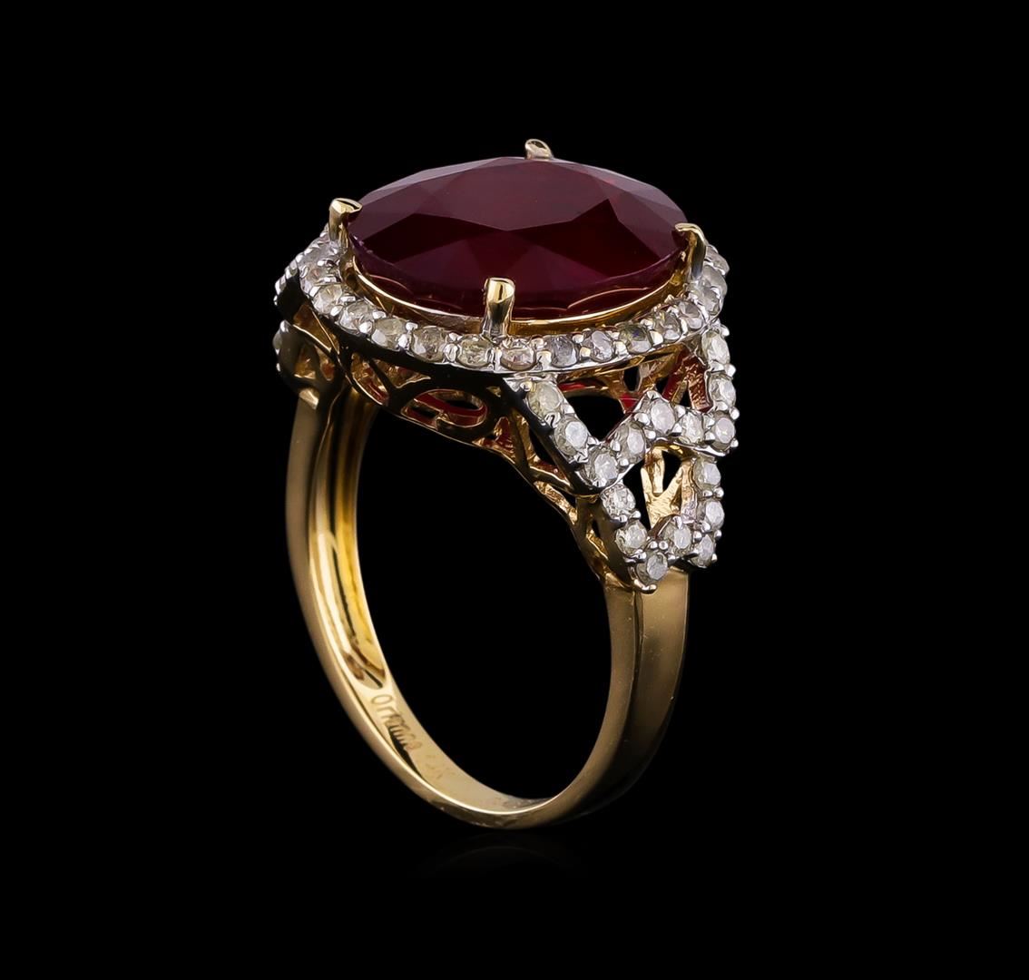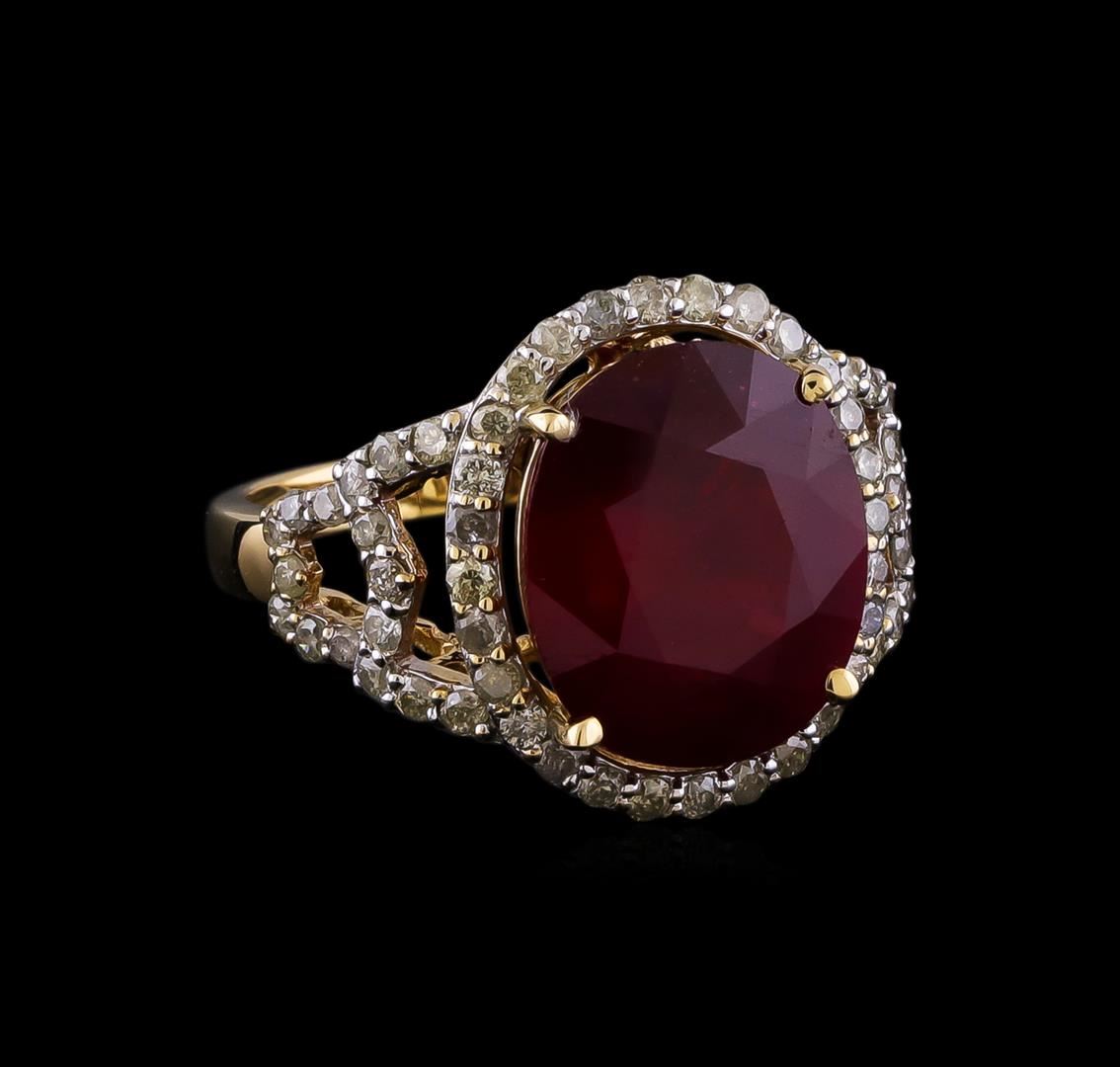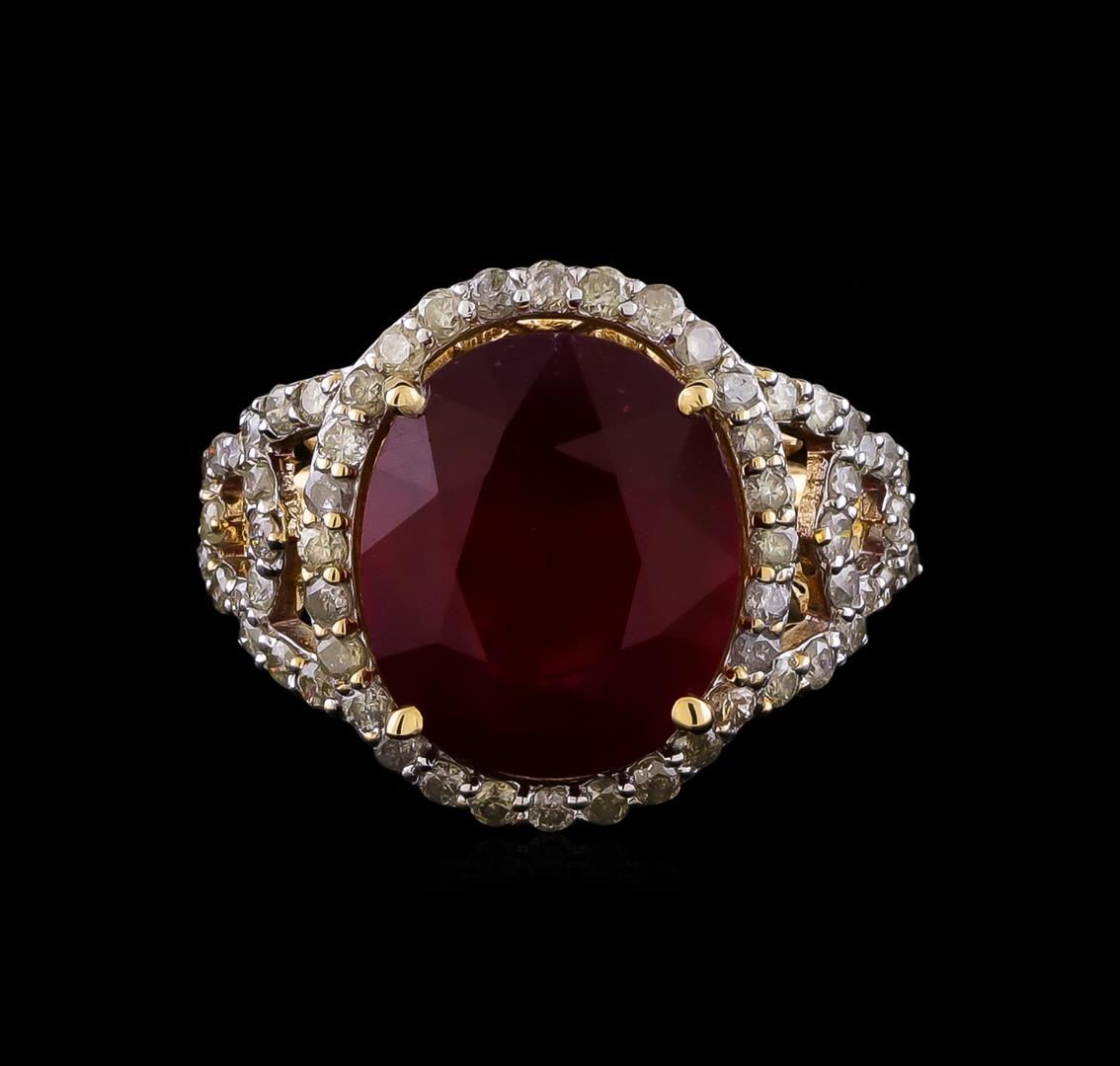 One electronically tested 14KT yellow gold ladies cast ruby and diamond ring. The featured ruby is set within a diamond bezel supported by an elaborate lattice under gallery and stylized diamond set shoulders, completed by a two millimeter wide band. Bright polish finish with rhodium accents. Trademark is Orianne. Identified with markings of "14K". Condition is new, good workmanship. Containing: One prong set oval mixed cut natural ruby approximate weight of 8.79ct., clarity is heavily included, type II, medium dark, very slightly brownish, slightly purplish red color, (GIA slpR 6/3), cut is good. Transmitting light somewhat diffusely, transparent to translucent. Naturally occurring internal & external characteristics are present. Indications of laboratory high temperature heat treatment, with glass & flux additives. Graded in the setting. Ruby has a low tolerance to rhodium plating, repolishing the surface, & ultrasonic cleaning. Sixty prong set round brilliant cut diamonds approximate total weight of 60 Stones = 0.87ct. Graded in the setting. Clarity: I-1 to I-3. Color: I - K. Total Weight of Colored Stones 8.79ct. Total Weight of Diamonds 0.87ct. Total Weight of Ring 5.49gm. AIG Appraised at $3,945.00.