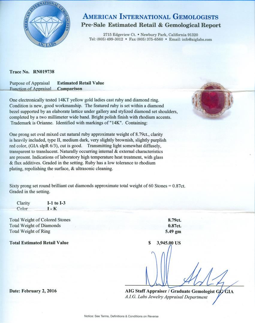 One electronically tested 14KT yellow gold ladies cast ruby and diamond ring. The featured ruby is set within a diamond bezel supported by an elaborate lattice under gallery and stylized diamond set shoulders, completed by a two millimeter wide band. Bright polish finish with rhodium accents. Trademark is Orianne. Identified with markings of "14K". Condition is new, good workmanship. Containing: One prong set oval mixed cut natural ruby approximate weight of 8.79ct., clarity is heavily included, type II, medium dark, very slightly brownish, slightly purplish red color, (GIA slpR 6/3), cut is good. Transmitting light somewhat diffusely, transparent to translucent. Naturally occurring internal & external characteristics are present. Indications of laboratory high temperature heat treatment, with glass & flux additives. Graded in the setting. Ruby has a low tolerance to rhodium plating, repolishing the surface, & ultrasonic cleaning. Sixty prong set round brilliant cut diamonds approximate total weight of 60 Stones = 0.87ct. Graded in the setting. Clarity: I-1 to I-3. Color: I - K. Total Weight of Colored Stones 8.79ct. Total Weight of Diamonds 0.87ct. Total Weight of Ring 5.49gm. AIG Appraised at $3,945.00.