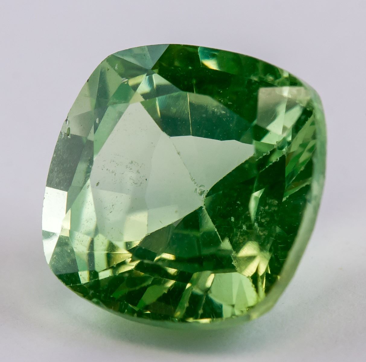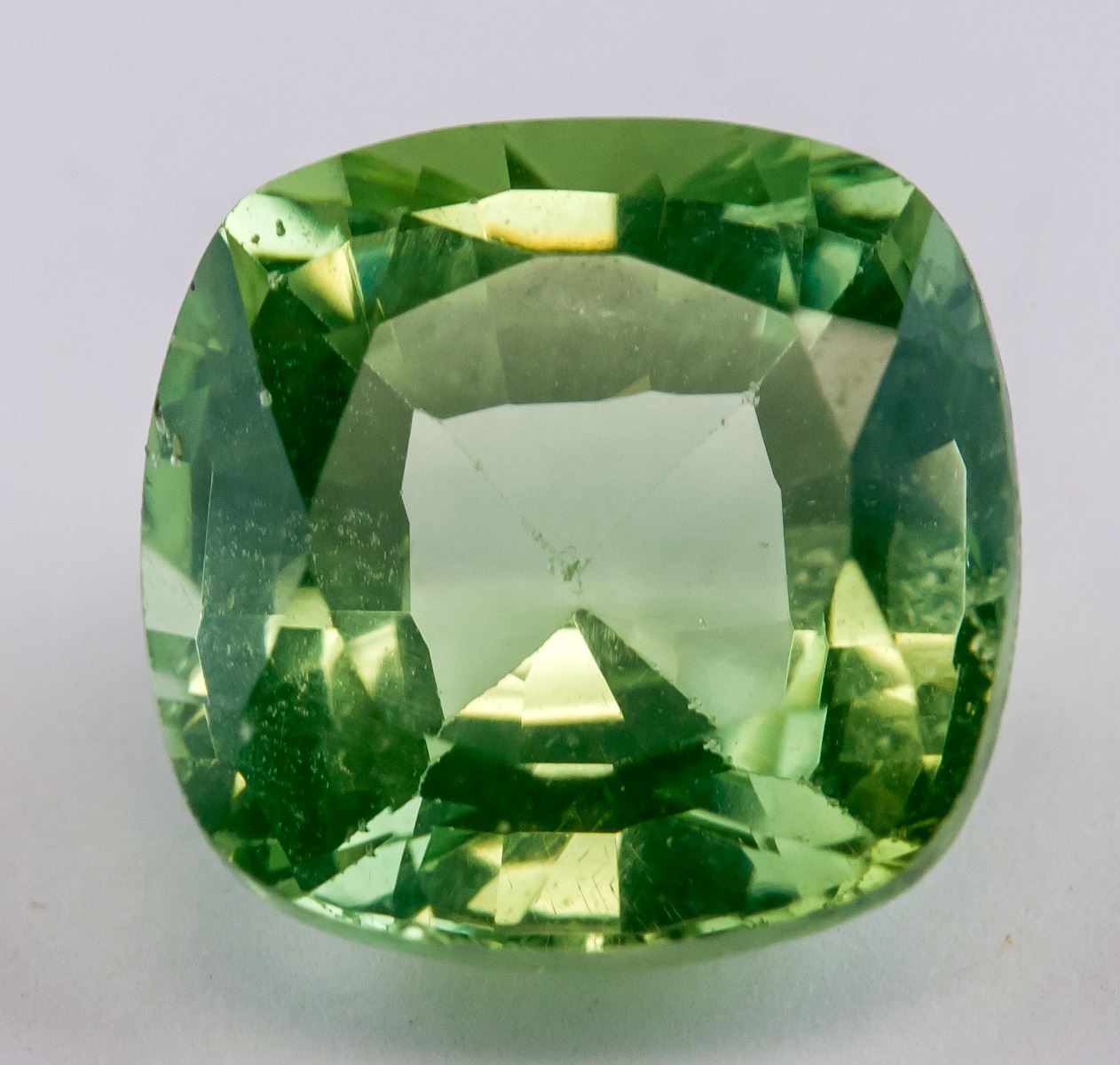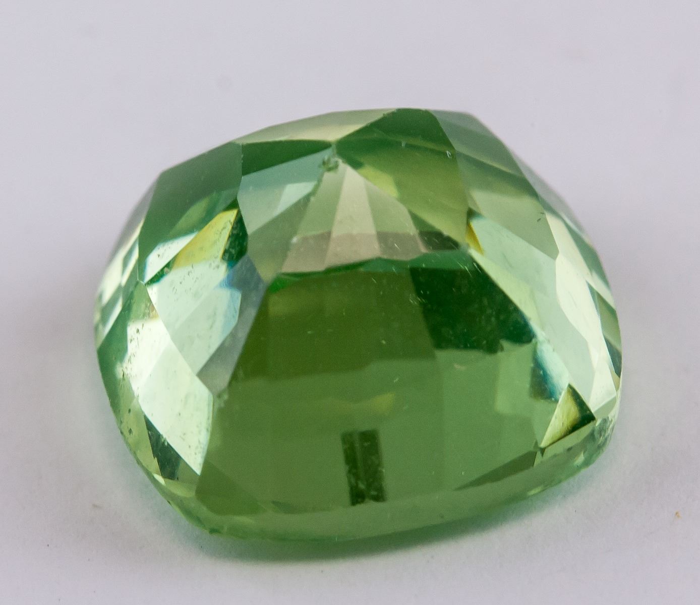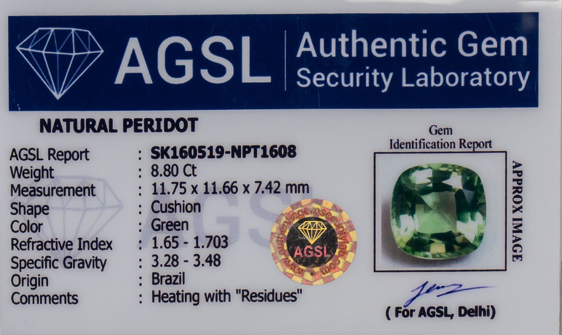 One (1) 8.80 Ct natural green peridot. Cushion cut. Origin Brazil. Accompanied with AGSL certificate. 11.75 x 11.66 x 7.42 mm