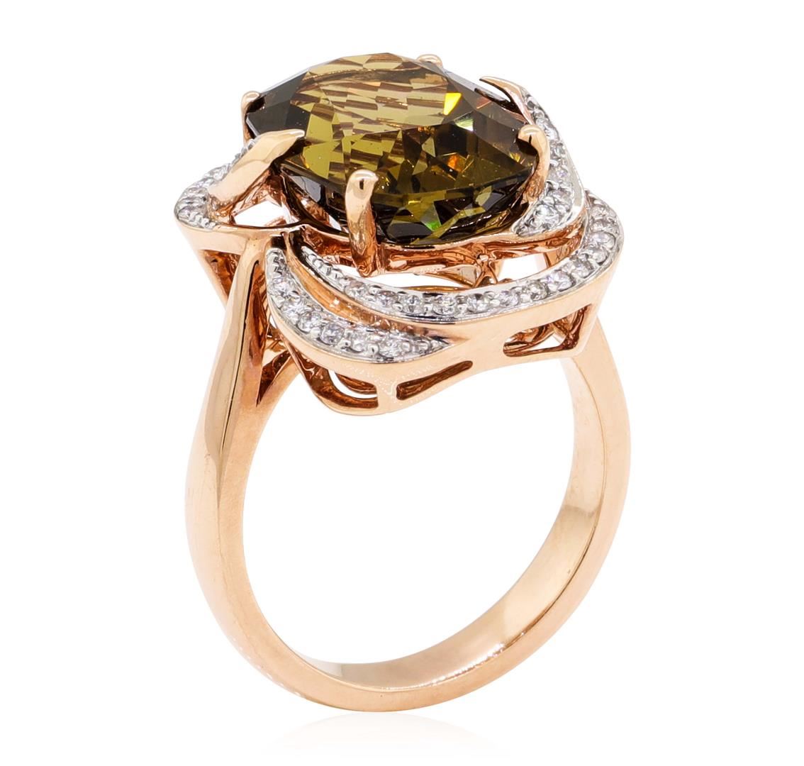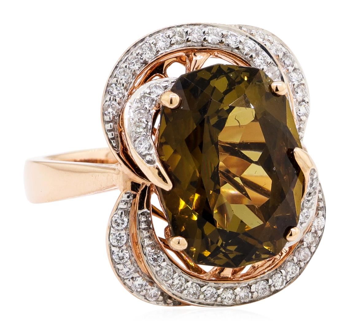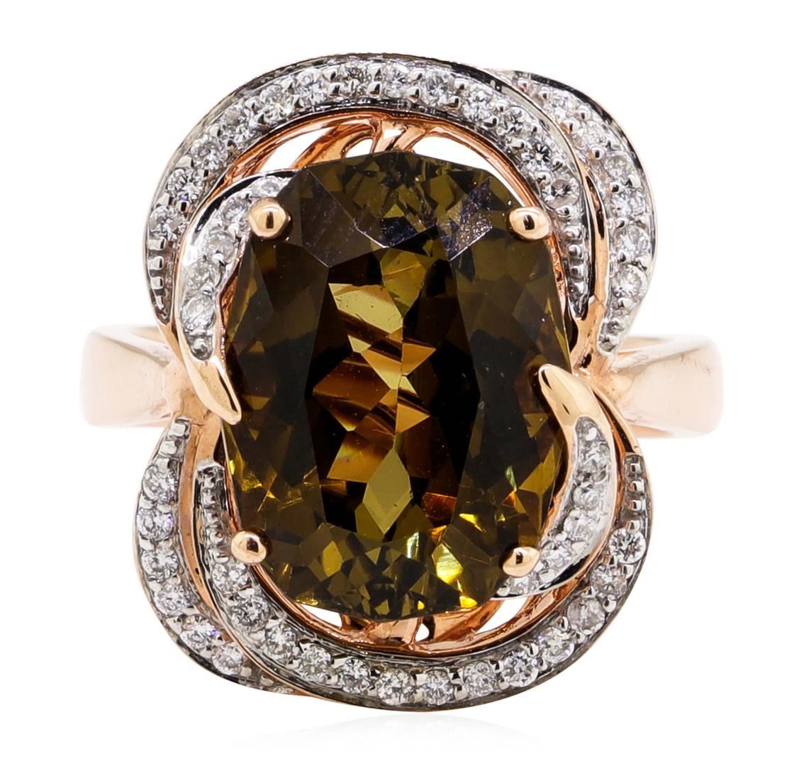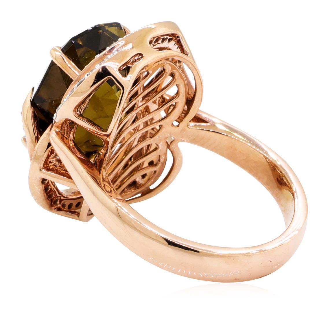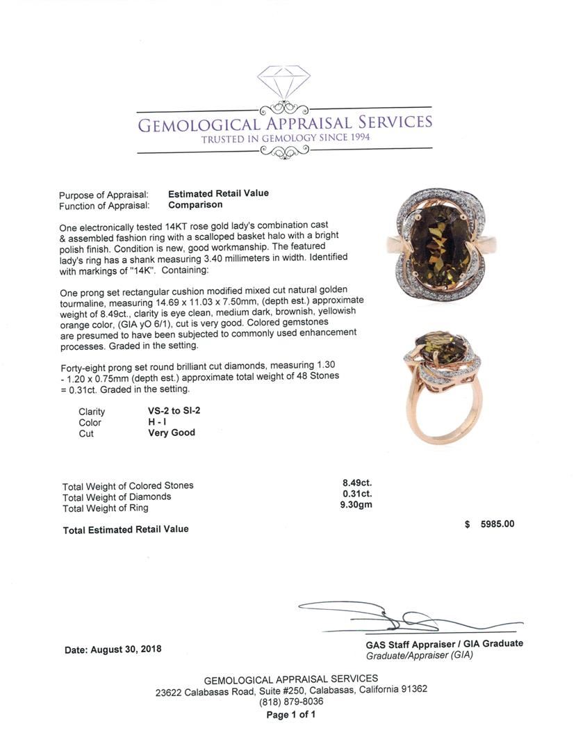 One electronically tested 14KT rose gold lady's combination cast & assembled fashion ring with a scalloped basket halo with a bright polish finish. The featured lady's ring has a shank measuring 3.40 millimeters in width. Identified with markings of '14K'. Condition is new, good workmanship. Containing: One prong set rectangular cushion modified mixed cut natural golden tourmaline, measuring 14.69 x 11.03 x 7.50mm, (depth est.) approximate weight of 8.49ct., clarity is eye clean, medium dark, brownish, yellowish orange color, (GIA yO 6/1), cut is very good. Colored gemstones are presumed to have been subjected to commonly used enhancement processes. Graded in the setting. Forty-Eight prong set round brilliant cut diamonds, measuring 1.30 - 1.20 x 0.75mm (depth est.) approximate total weight of 48 Stones = 0.31ct. Graded in the setting. Color H - I Clarity VS-2 to SI-2 Cut Very Good. Total Weight of Colored Stones 8.49ct.. Total Weight of Diamonds 0.31ct.. Total Weight of Ring 9.30gm GAS Appraised at $5985.00. GAS Appraised at $5,985.00.