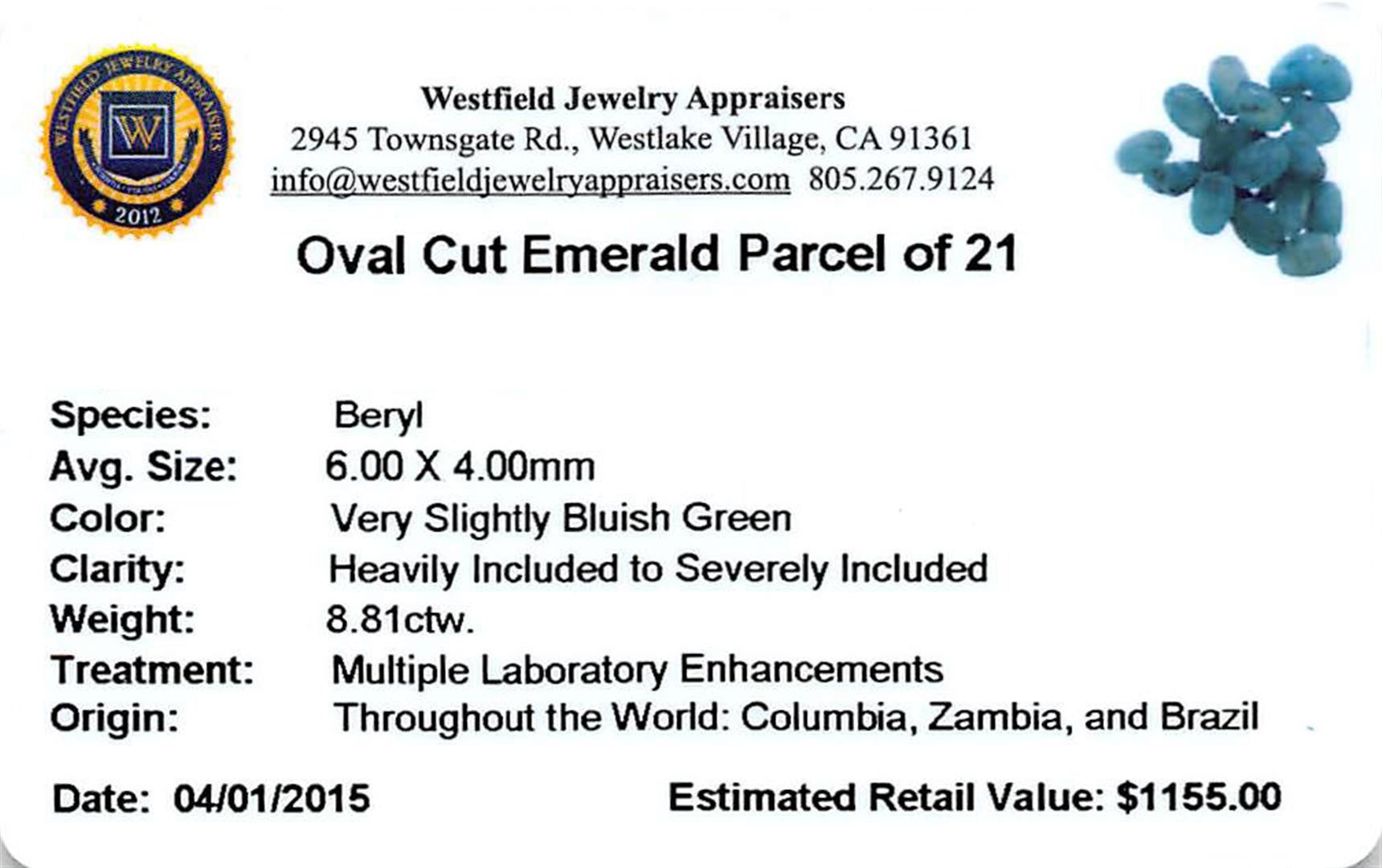 Twenty-one oval mixed cut natural emeralds exact total weight 8.81ct., clarity is heavily included, type III, medium dark, very slightly grayish, very slightly bluish green color, (GIA vslbG 6/3), cut is good. Westfield Appraised at $1,155.00.