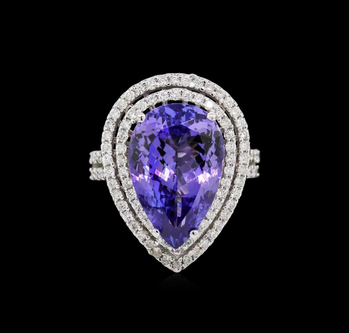 One electronically tested 14KT white gold lady's cast fashion ring with a split shank double halo with a bright polish finish. The featured lady's ring has a shank measuring 3.24 millimeters wide. Identified with markings of "K14". Condition is new, good workmanship. Containing: One prong set pear modified brilliant cut natural tanzanite, measuring 16.73 x 11.09 x 7.06mm, approximate weight of 8.82ct., clarity is eye clean, type I, medium, moderately strong, violetish blue color, (GIA vB 5/4), cut is very good. Transmitting light with no distortion, transparent. Colored gemstones are presumed to have been subjected to commonly used enhancement processes. Graded in the setting. Ninety-Six prong set round brilliant cut diamonds, measuring 1.40 - 1.25 x 0.80mm (depth est.) approximate total weight of 96 Stones = 0.80ct. Graded in the setting. Clarity: SI-1 to I-1. Color: G - I. Cut Good. Total Weight of Colored Stones 8.82ct. Total Weight of Diamonds 0.80ct. Total Weight of Ring 9.40gm. GAS Appraised at $17,595.00.