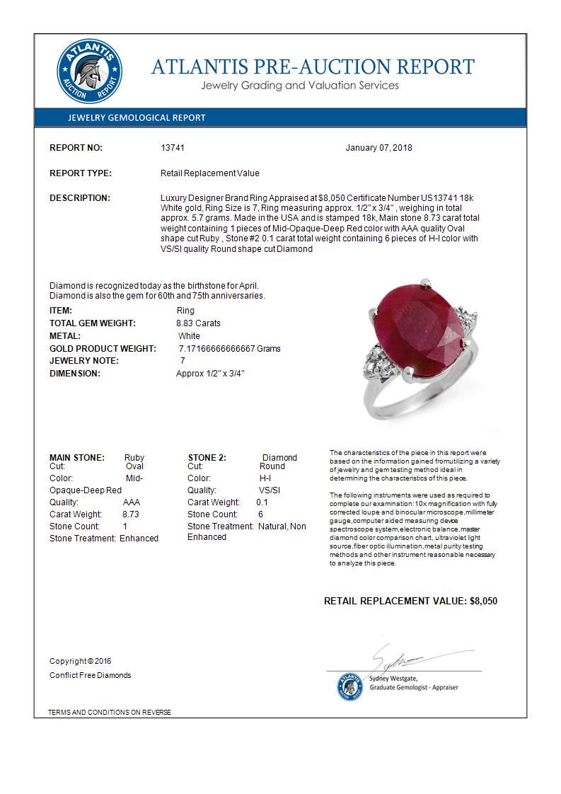 REF-112F8N -13741 ---- 8.83 CTW Ruby & Diamond Ring 18K White Gold ---- Luxury Designer Brand Ring Appraised at $8,050 Certificate Number US13741 18k White gold, Ring Size is 7, Ring measuring approx. 1/2" x 3/4" , weighing in total approx. 5.7 grams. Made in the USA and is stamped 18k, Main stone 8.73 carat total weight containing 1 pieces of Mid-Opaque-Deep Red color with AAA quality Oval shape cut Ruby , Stone #2 0.1 carat total weight containing 6 pieces of H-I color with VS/SI quality Round shape cut Diamond