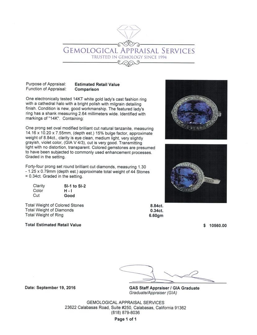 One electronically tested 14KT white gold lady's cast fashion ring with a cathedral halo with a bright polish with milgrain detailing finish. The featured lady's ring has a shank measuring 2.64 millimeters wide. Identified with markings of '14K'. Condition is new, good workmanship. Containing: One prong set oval modified brilliant cut natural tanzanite, measuring 14.16 x 10.20 x 7.55mm, (depth est.) 15%. bulge factor, approximate weight of 8.84ct., clarity is eye clean, medium light, very slightly grayish, violet color, (GIA V 4/3), cut is very good. Transmitting light with no distortion, transparent. Colored gemstones are presumed to have been subjected to commonly used enhancement processes. Graded in the setting. Forty-Four prong set round brilliant cut diamonds, measuring 1.30 - 1.25 x 0.79mm (depth est.) approximate total weight of 44 Stones = 0.34ct. Graded in the setting. Clarity SI-1 to SI-2. Color: H - I Cut Good. Total Weight of Colored Stones 8.84ct.. Total Weight of Diamonds 0.34ct.. Total Weight of Ring 6.60gm. GAS Appraised at $10,560.00.