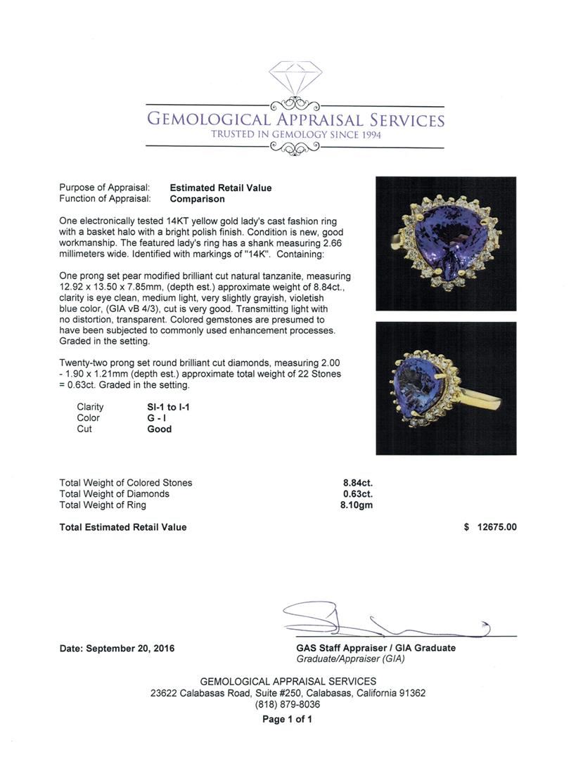 One electronically tested 14KT yellow gold lady's cast fashion ring with a basket halo with a bright polish finish. The featured lady's ring has a shank measuring 2.66 millimeters wide. Identified with markings of '14K'. Condition is new, good workmanship. Containing: One prong set pear modified brilliant cut natural tanzanite, measuring 12.92 x 13.50 x 7.85mm, (depth est.) approximate weight of 8.84ct., clarity is eye clean, medium light, very slightly grayish, violetish blue color, (GIA vB 4/3), cut is very good. Transmitting light with no distortion, transparent. Colored gemstones are presumed to have been subjected to commonly used enhancement processes. Graded in the setting. Twenty-Two prong set round brilliant cut diamonds, measuring 2.00 - 1.90 x 1.21mm (depth est.) approximate total weight of 22 Stones = 0.63ct. Graded in the setting. Clarity SI-1 to I-1. Color: G - I Cut Good. Total Weight of Colored Stones 8.84ct.. Total Weight of Diamonds 0.63ct.. Total Weight of Ring 8.10gm. GAS Appraised at $12,675.00.
