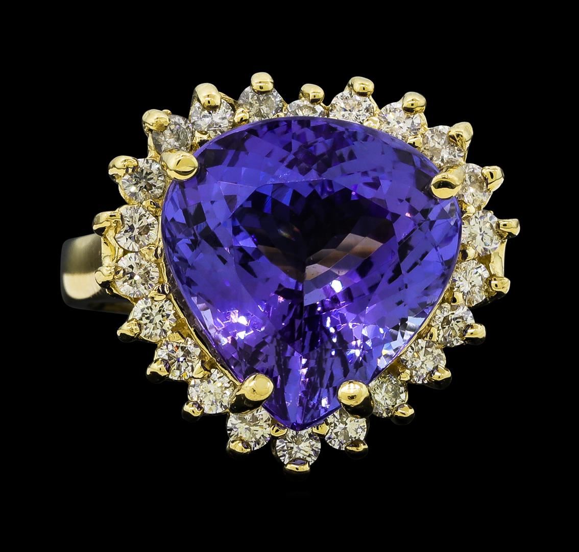 One electronically tested 14KT yellow gold lady's cast fashion ring with a basket halo with a bright polish finish. The featured lady's ring has a shank measuring 2.66 millimeters wide. Identified with markings of '14K'. Condition is new, good workmanship. Containing: One prong set pear modified brilliant cut natural tanzanite, measuring 12.92 x 13.50 x 7.85mm, (depth est.) approximate weight of 8.84ct., clarity is eye clean, medium light, very slightly grayish, violetish blue color, (GIA vB 4/3), cut is very good. Transmitting light with no distortion, transparent. Colored gemstones are presumed to have been subjected to commonly used enhancement processes. Graded in the setting. Twenty-Two prong set round brilliant cut diamonds, measuring 2.00 - 1.90 x 1.21mm (depth est.) approximate total weight of 22 Stones = 0.63ct. Graded in the setting. Clarity SI-1 to I-1. Color: G - I Cut Good. Total Weight of Colored Stones 8.84ct.. Total Weight of Diamonds 0.63ct.. Total Weight of Ring 8.10gm. GAS Appraised at $12,675.00.
