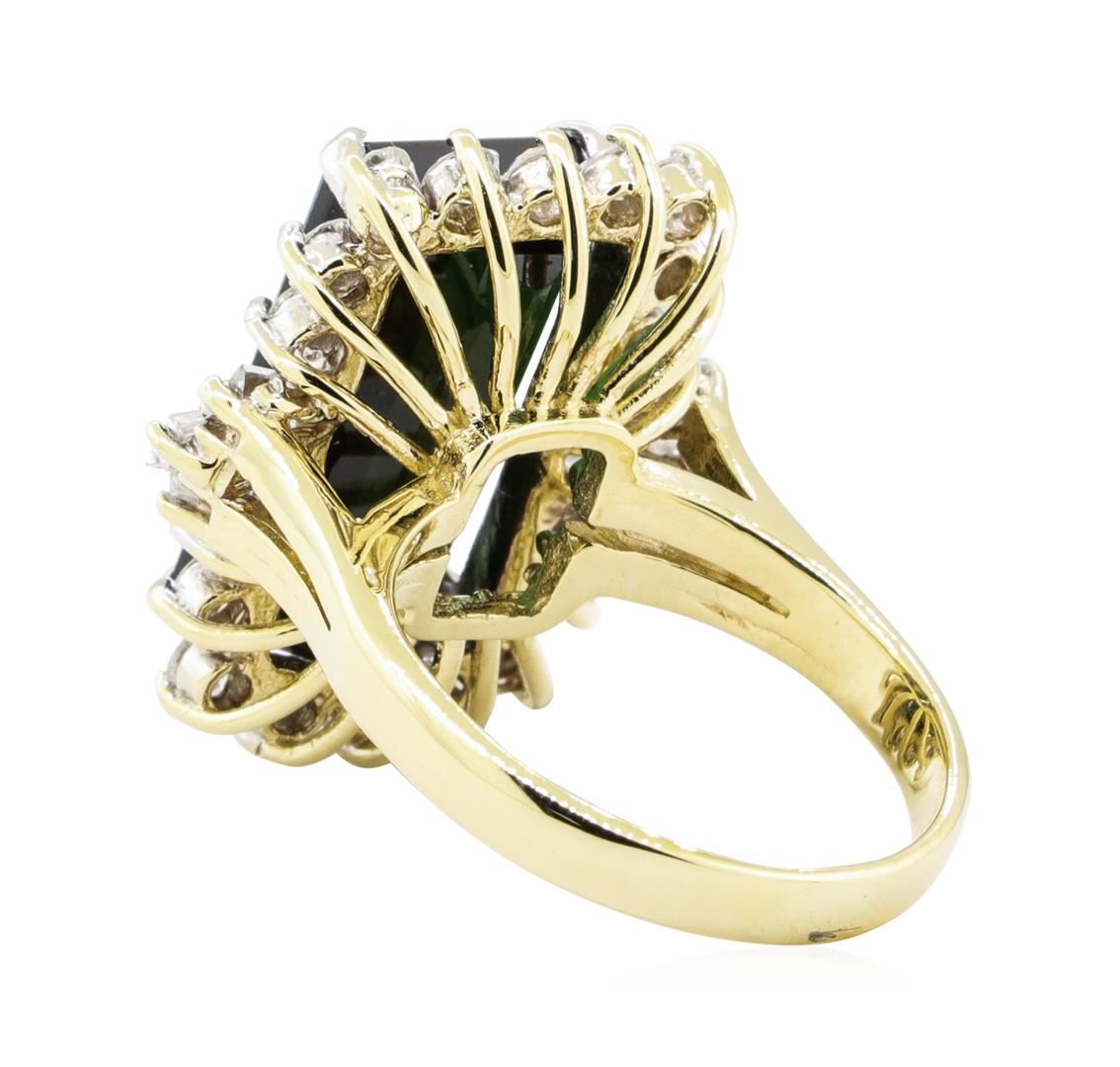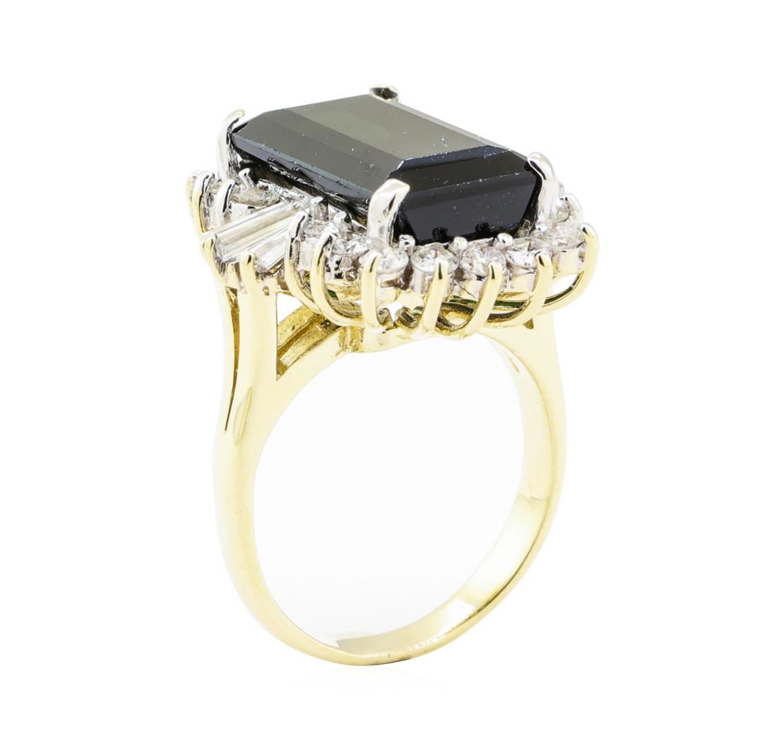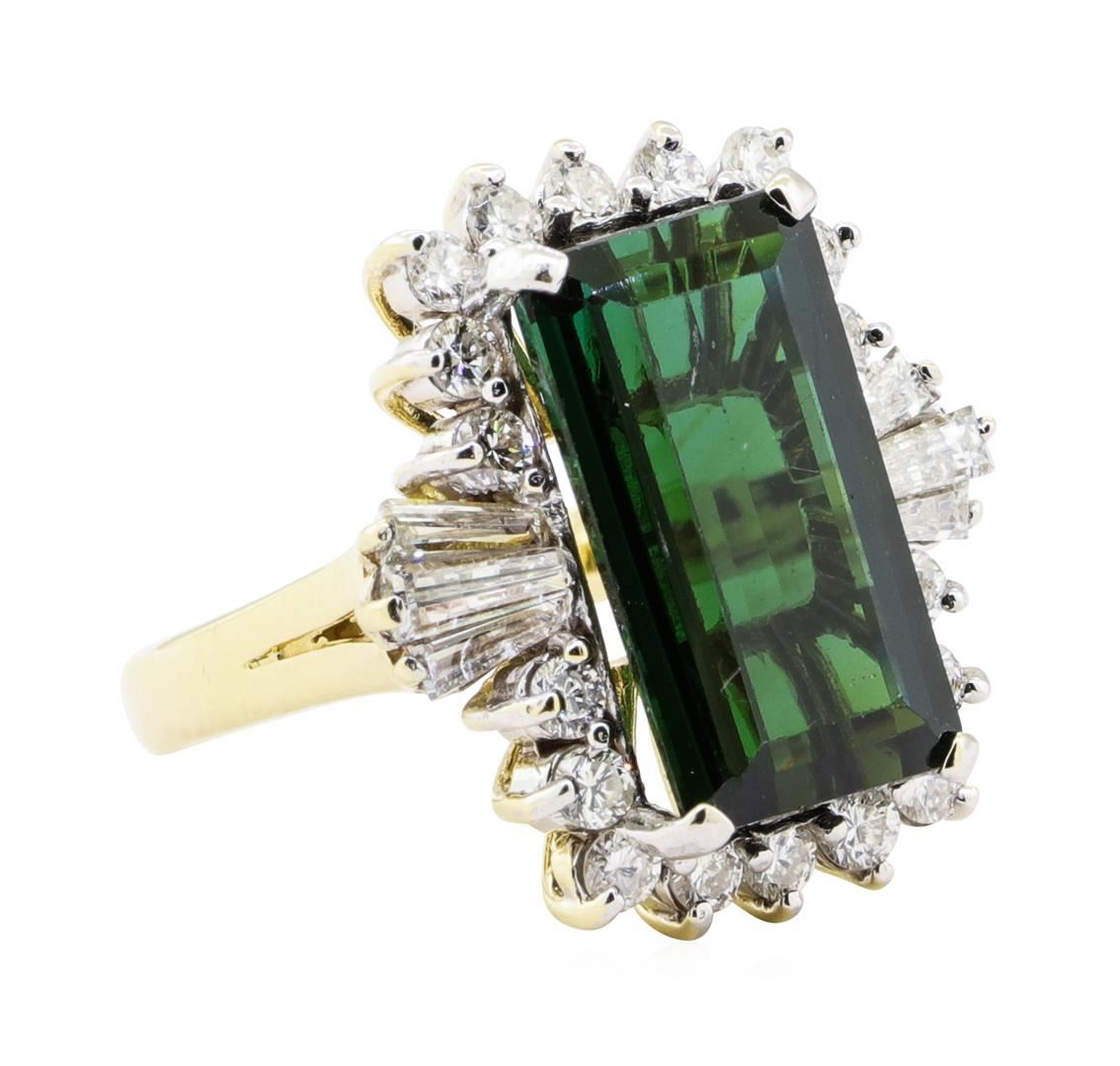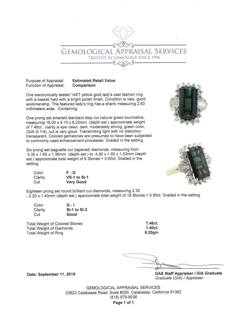 One electronically tested 14KT yellow gold lady's cast fashion ring with a basket halo with a bright polish finish. The featured lady's ring has a shank measuring 2.63 millimeters wide. Condition is new, good workmanship. Containing: One prong set emerald standard step cut natural green tourmaline, measuring 16.00 x 9.10 x 6.20mm, (depth est.) approximate weight of 7.46ct., clarity is eye clean, dark, moderately strong, green color, (GIA G 7/4), cut is very good. Transmitting light with no distortion, transparent. Colored gemstones are presumed to have been subjected to commonly used enhancement processes. Graded in the setting. Six prong set baguette cut (tapered) diamonds, measuring from 4.30 x 1.60 x 1.36mm (depth est.) to 4.90 x 1.80 x 1.53mm (depth est.) approximate total weight of 6 Stones = 0.60ct. Graded in the setting. Color F - G Clarity VS-1 to SI-1 Cut Very Good Eighteen prong set round brilliant cut diamonds, measuring 2.30 - 2.20 x 1.40mm (depth est.) approximate total weight of 18 Stones = 0.80ct. Graded in the setting. Color G - I Clarity SI-1 to SI-2 Cut Good. Total Weight of Colored Stones 7.46ct.. Total Weight of Diamonds 1.40ct.. Total Weight of Ring 8.20gm GAS Appraised at $8705.00. GAS Appraised at $8,705.00.