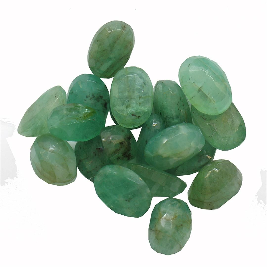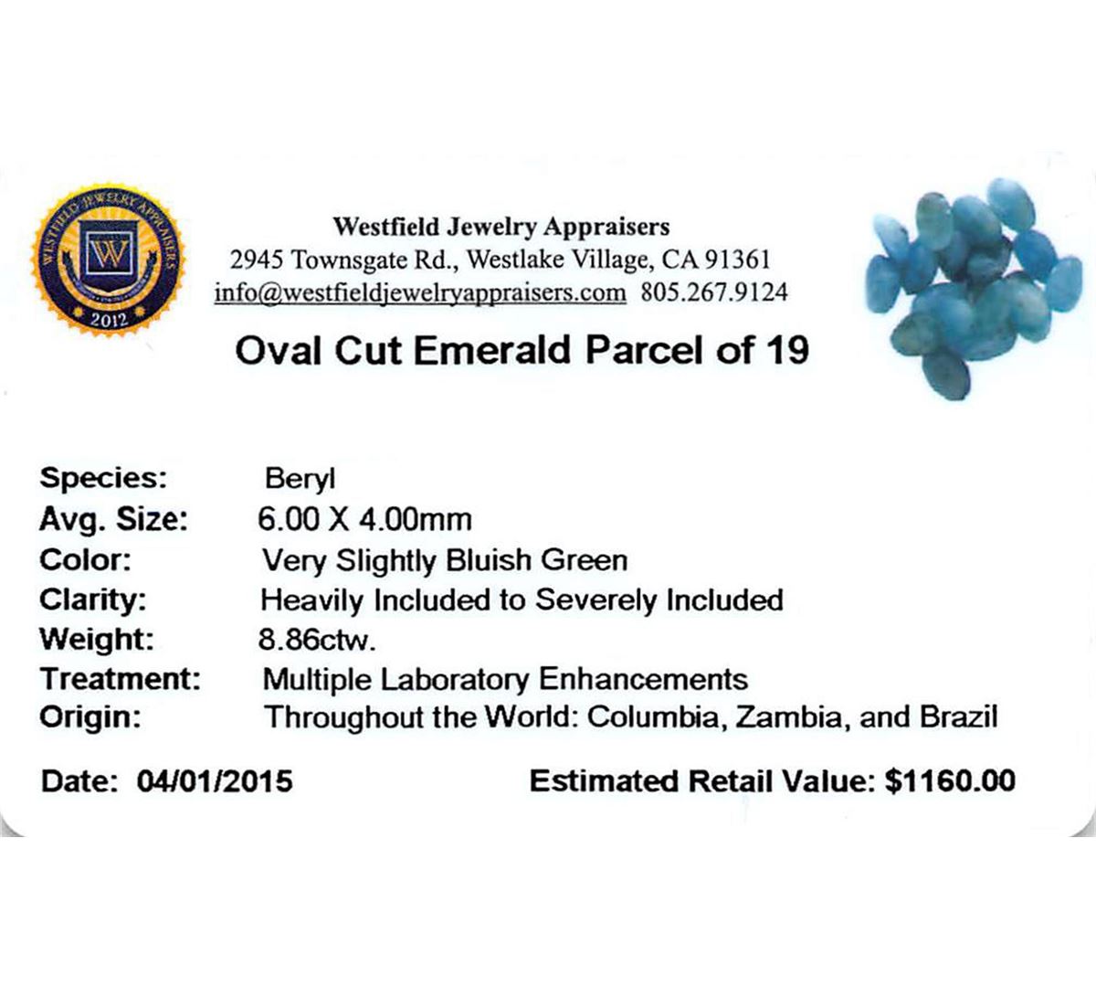 Nineteen oval mixed cut natural emeralds exact total weight 8.86ct., clarity is heavily included, type III, medium dark, very slightly grayish, very slightly bluish green color, (GIA vslbG 6/3), cut is good. Westfield Appraised at $1,160.00.