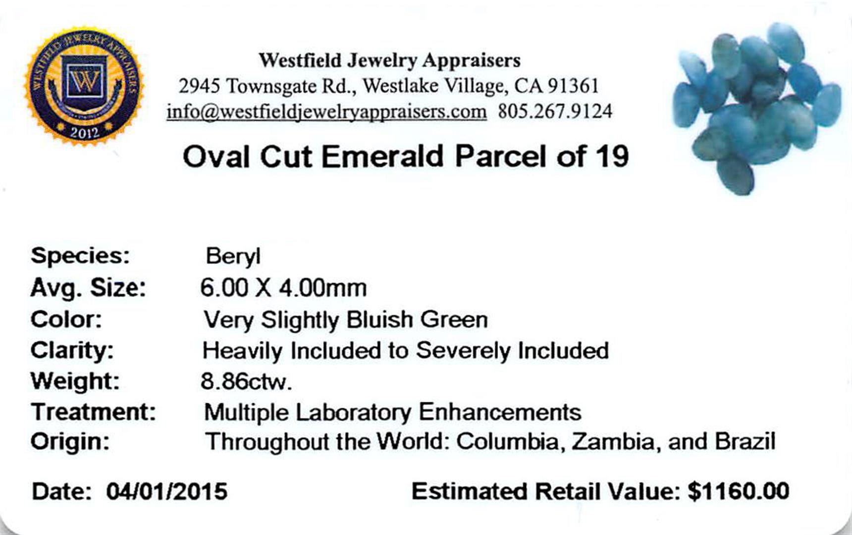 Nineteen oval mixed cut natural emeralds exact total weight 8.86ct., clarity is heavily included, type III, medium dark, very slightly grayish, very slightly bluish green color, (GIA vslbG 6/3), cut is good. Westfield Appraised at $1,160.00.