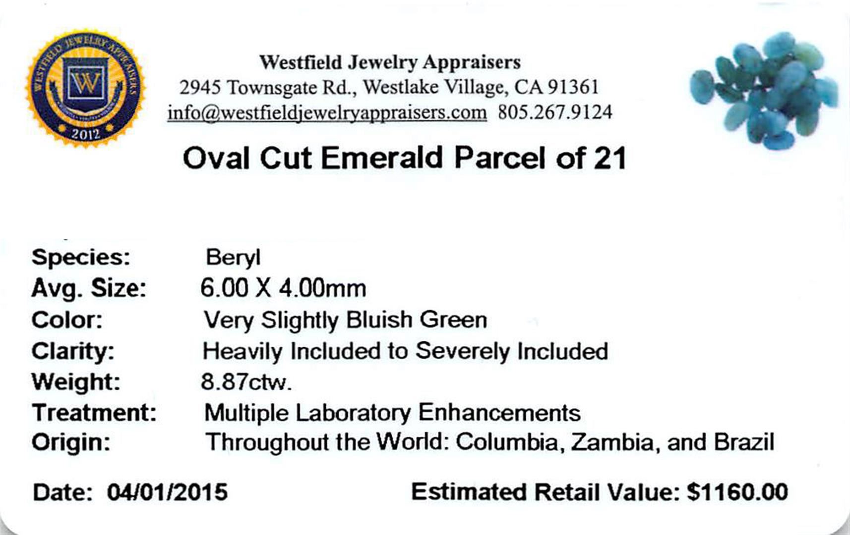 Twenty-one oval mixed cut natural emeralds exact total weight 8.87ct., clarity is heavily included, type III, medium dark, very slightly grayish, very slightly bluish green color, (GIA vslbG 6/3), cut is good. Westfield Appraised at $1,160.00.