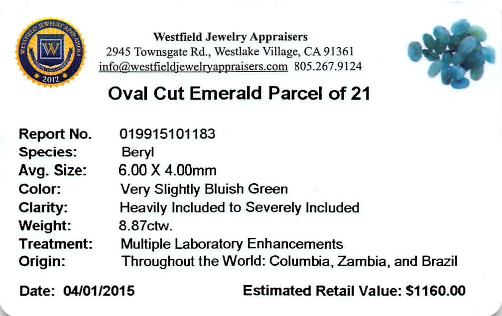 Twenty-one oval mixed cut natural emeralds exact total weight 8.87ct., clarity is heavily included, type III, medium dark, very slightly grayish, very slightly bluish green color, (GIA vslbG 6/3), cut is good. Westfield Appraised at $1,160.00.