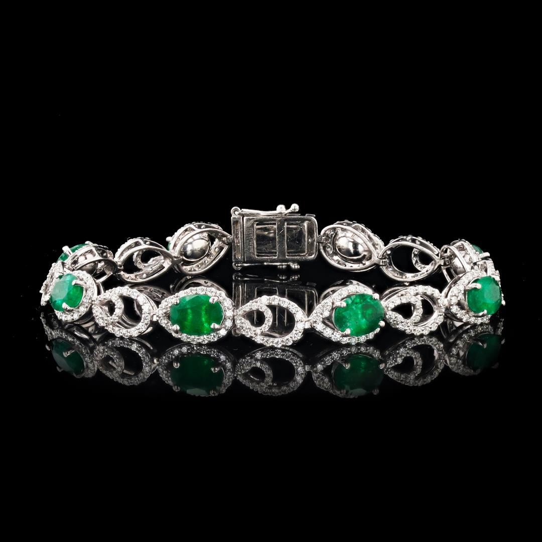 One polished, stamped, and tested platinum bracelet mounted with: 8 genuine faceted emeralds weighing approximately 8.88 carats, and 344 genuine round diamonds weighing approximately 2.87 carats. The bracelet measures 7.5 inches in length and is finished with a tension lock clasp and double safety clasp. This item weighs 25.0 grams, condition is new, excellent workmanship. #MAIN GEMSTONES# Species: Natural Beryl Variety: Emerald Shape: Oval Cutting Style: Brilliant Cut Crown, Step Cut Pavilion Quantity: 8 Emeralds Measurements: 8 x 6mm Total Weight: 8.88 carats Color: Green Cut Grade: Very Good Refractive Index: 1.564 - 1.595 DR Birefringence: 0.005 to 0.009 Hardness: 7.5 - 8 #ADJACENT GEMSTONES ON BRACELET# Identity: Natural Diamond Shape: Round Cutting Style: Brilliant Cut Quantity: 344 Diamonds Measurements: 1.0 - 1.2mm Total Weight: 2.87 carats Clarity Grade: SI1-I1 Color Grade: G - I Refractive Index: 2.418 Hardness: 10 TOTAL EMERALD WEIGHT: 8.88 cts TOTAL DIAMOND WEIGHT: 2.87 cts WEIGHT OF ITEM: 25.0 grams METAL: Platinum Size: 7 1/2