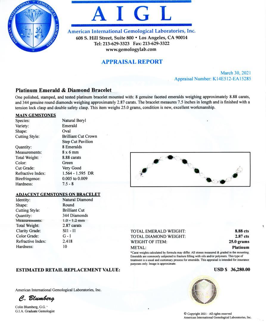 One polished, stamped, and tested platinum bracelet mounted with: 8 genuine faceted emeralds weighing approximately 8.88 carats, and 344 genuine round diamonds weighing approximately 2.87 carats. The bracelet measures 7.5 inches in length and is finished with a tension lock clasp and double safety clasp. This item weighs 25.0 grams, condition is new, excellent workmanship. #MAIN GEMSTONES# Species: Natural Beryl Variety: Emerald Shape: Oval Cutting Style: Brilliant Cut Crown, Step Cut Pavilion Quantity: 8 Emeralds Measurements: 8 x 6mm Total Weight: 8.88 carats Color: Green Cut Grade: Very Good Refractive Index: 1.564 - 1.595 DR Birefringence: 0.005 to 0.009 Hardness: 7.5 - 8 #ADJACENT GEMSTONES ON BRACELET# Identity: Natural Diamond Shape: Round Cutting Style: Brilliant Cut Quantity: 344 Diamonds Measurements: 1.0 - 1.2mm Total Weight: 2.87 carats Clarity Grade: SI1-I1 Color Grade: G - I Refractive Index: 2.418 Hardness: 10 TOTAL EMERALD WEIGHT: 8.88 cts TOTAL DIAMOND WEIGHT: 2.87 cts WEIGHT OF ITEM: 25.0 grams METAL: Platinum Size: 7 1/2