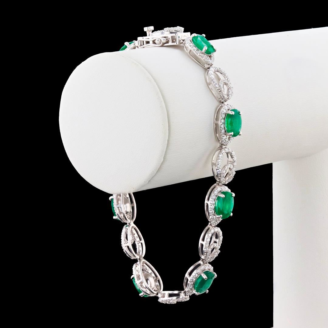 One polished, stamped, and tested platinum bracelet mounted with: 8 genuine faceted emeralds weighing approximately 8.88 carats, and 344 genuine round diamonds weighing approximately 2.87 carats. The bracelet measures 7.5 inches in length and is finished with a tension lock clasp and double safety clasp. This item weighs 25.0 grams, condition is new, excellent workmanship. #MAIN GEMSTONES# Species: Natural Beryl Variety: Emerald Shape: Oval Cutting Style: Brilliant Cut Crown, Step Cut Pavilion Quantity: 8 Emeralds Measurements: 8 x 6mm Total Weight: 8.88 carats Color: Green Cut Grade: Very Good Refractive Index: 1.564 - 1.595 DR Birefringence: 0.005 to 0.009 Hardness: 7.5 - 8 #ADJACENT GEMSTONES ON BRACELET# Identity: Natural Diamond Shape: Round Cutting Style: Brilliant Cut Quantity: 344 Diamonds Measurements: 1.0 - 1.2mm Total Weight: 2.87 carats Clarity Grade: SI1-I1 Color Grade: G - I Refractive Index: 2.418 Hardness: 10 TOTAL EMERALD WEIGHT: 8.88 cts TOTAL DIAMOND WEIGHT: 2.87 cts WEIGHT OF ITEM: 25.0 grams METAL: Platinum Size: 7 1/2